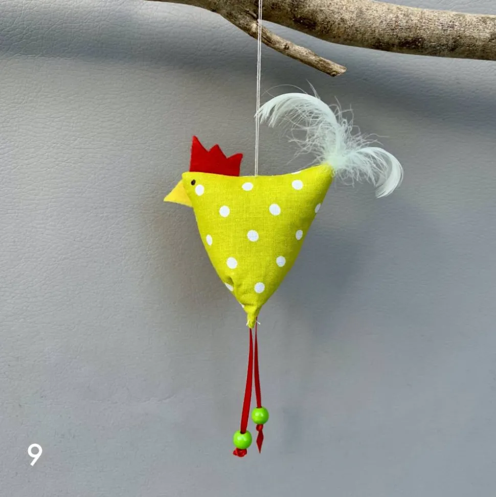 Diese handgefertigten Stoffhühner sind für die jahreszeitliche Dekoration zu Ostern gedacht.