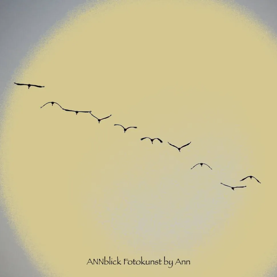 Hier vereinen sich Fotografie und Illustration. Kraniche, auf dem Weg in den Süden. Das weckt Fernweh. Magst du die verträumte und beruhigende Szene mit den dezenten Farben so wie ich?