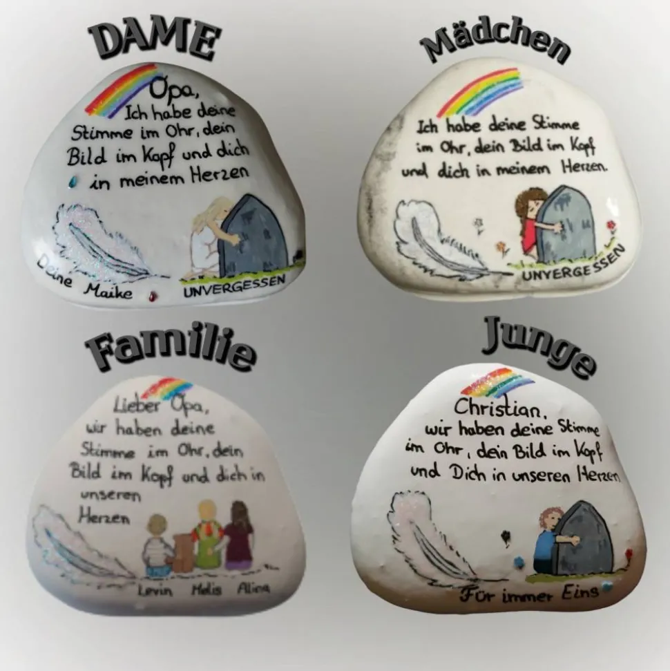 Dieser Trauerstein ist eine Spezialanfertigung und wird nur für Sie gemalt. Er trägt die Essenz Ihrer Erinnerungen, Liebe und Ihres Verlusts. Jeder Stein ist ein Symbol für die Einzigartigkeit eines Lebens, für Momente, die unvergessen bleiben. Sie sind Kunstwerke mit Herzblut und Hingabe, geschaffen, um die Schönheit des Lebens und die Liebe festzuhalten. Jeder Stein ist ein Unikat, das dazu bestimmt ist, zu berühren und zu verzaubern.