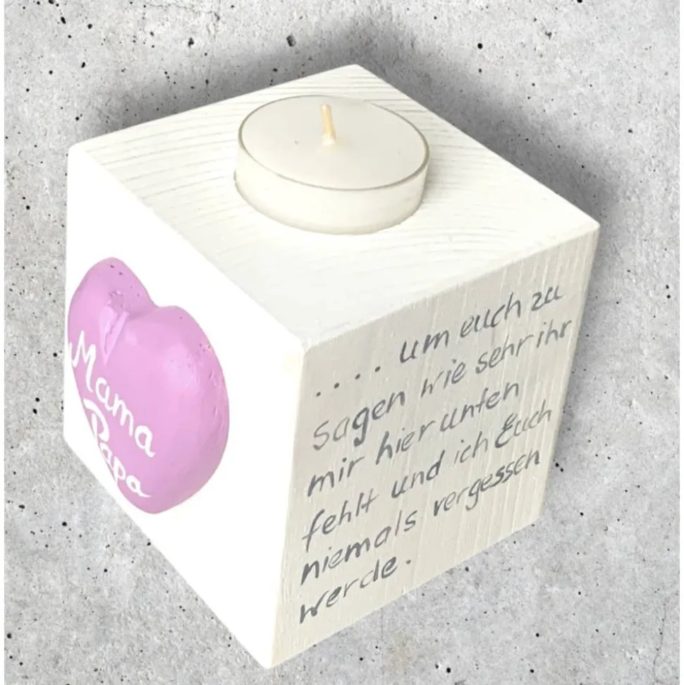 Ein individuell bemalter Kerzenwürfel ist ein einzigartiges und persönliches Geschenk für viele Anlässe, insbesondere als Trauerlicht oder zur Erinnerung an Eltern. Jeder Teelichtwürfel wird nach deinem Kauf exklusiv für dich gestaltet und bemalt, sodass du ein echtes Unikat erhältst.