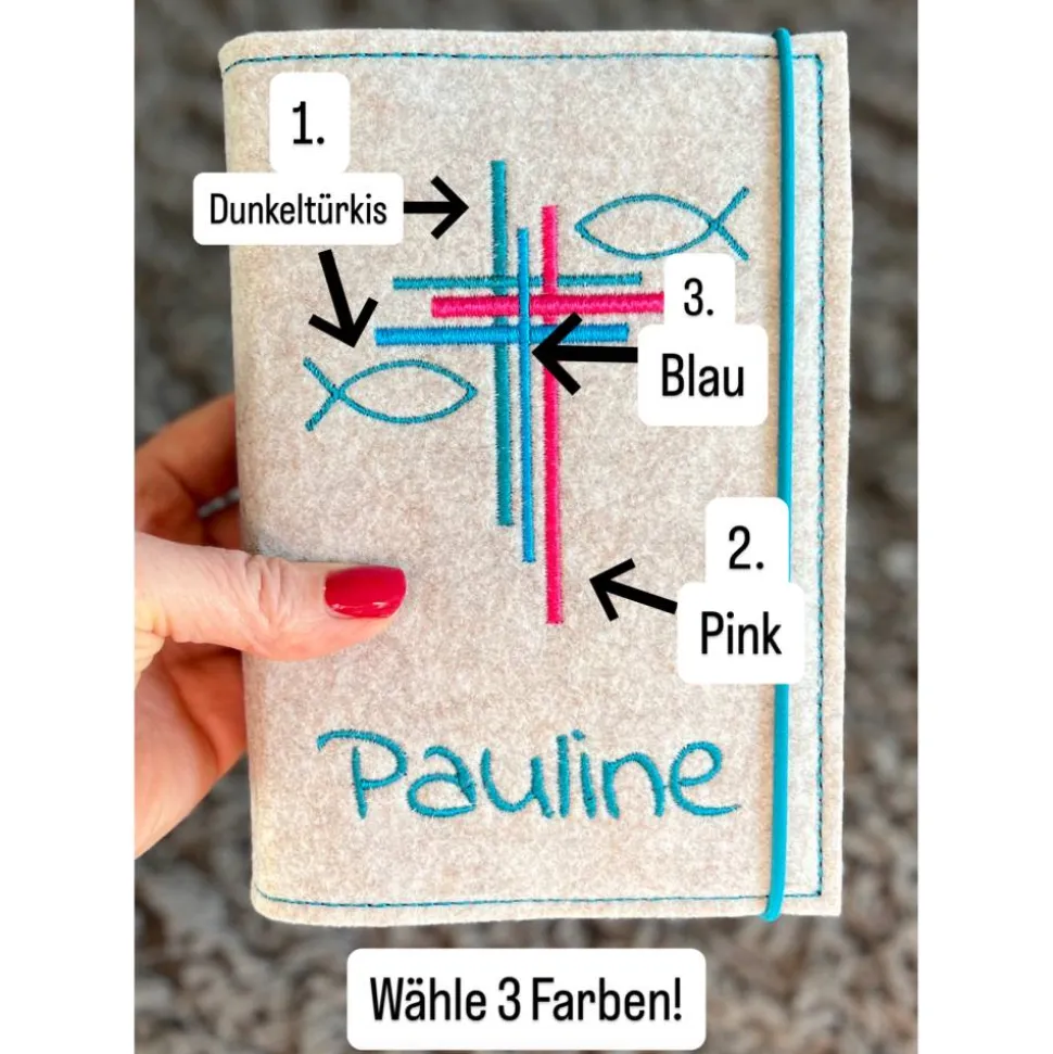 Schütze dein Gotteslob stilvoll mit einer einzigartigen Gotteslobhülle aus hochwertigem, 3mm starkem Polyesterfilz (100%), liebevoll handgefertigt in Deutschland. Wähle aus verschiedenen Farben und passe deine Hülle individuell an: Bestimme die Schriftart, entscheide dich für einen Druckknopf oder ein Gummiband als Verschluss und wähle deine Lieblingsfarbe für den Filz. Die Farben deines gewählten Designs werden exakt übernommen und mit Markenstickgarn aufwendig bestickt – kein Aufdruck, sondern echte Handarbeit für langanhaltende Freude.