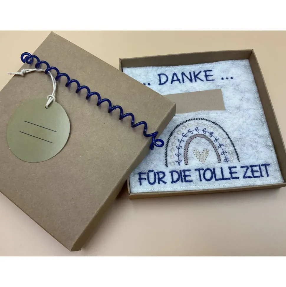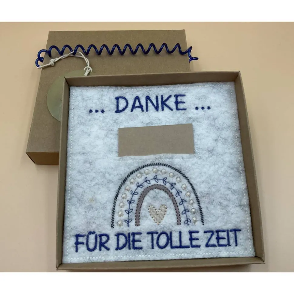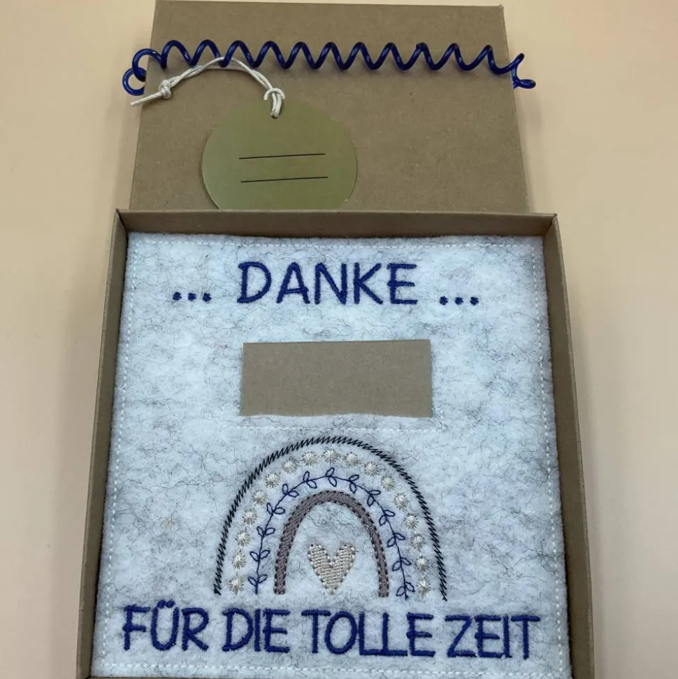 Im Inneren eine bestickte Filzkarte mit Einschub für Geld oder eine Botschaft, oder Beides!