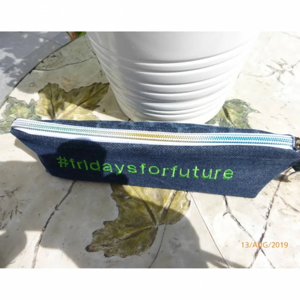 Upcycling aus einer Jeans und einem tollen Baumwollstoff, versehen mit einem Regenbogenreißverschluss und einem Anhänger mt der Message ’never never give up‘.