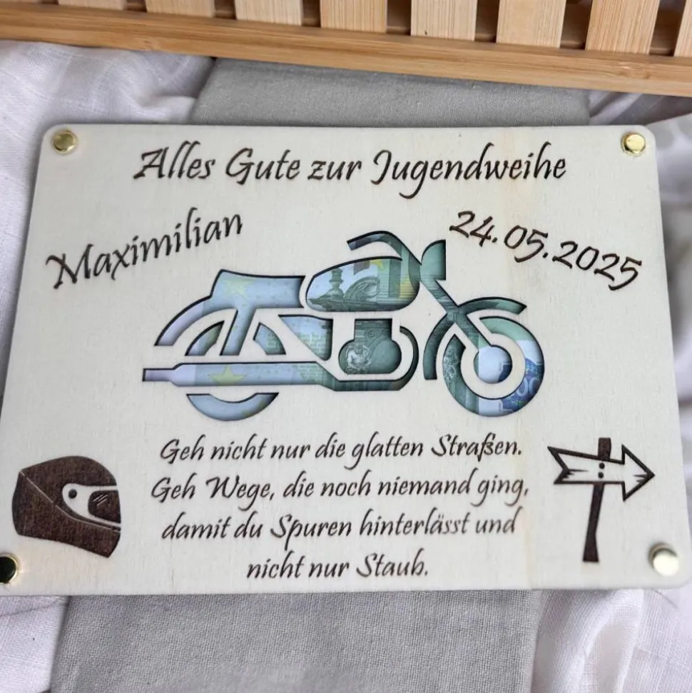 Dieses personalisierte Geldgeschenk besteht aus zwei übereinanderliegenden 3mm starken Pappelsperrholzplatten, diese werden mithilfe von 4 Rundkopfklammern zusammengehalten und dienen somit als Geldfach (jeder Geldscheinwert kann integriert werden). Wir können dieses Geldgeschenk zu verschiedenen Anlässen für euch herstellen, bitte bei der Bestellung den Anlass auswählen. Wir passen dann die Überschrift passend zum ausgewählten Anlass an.