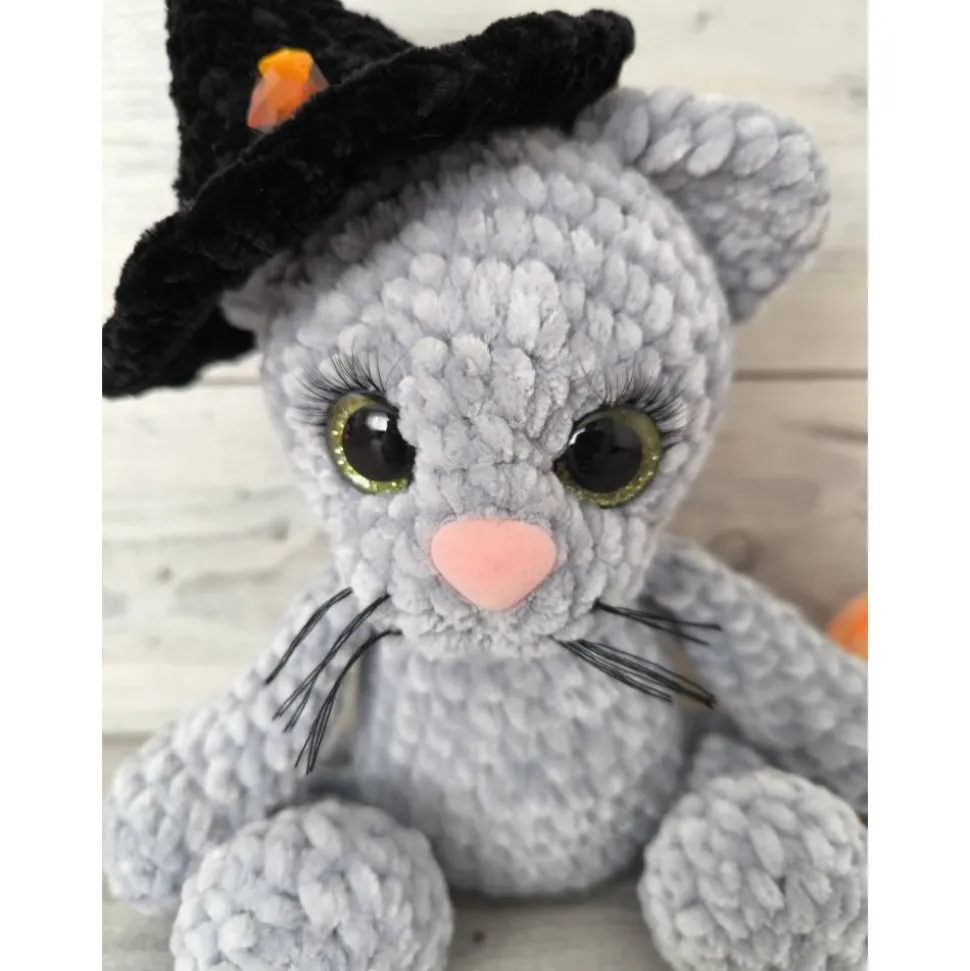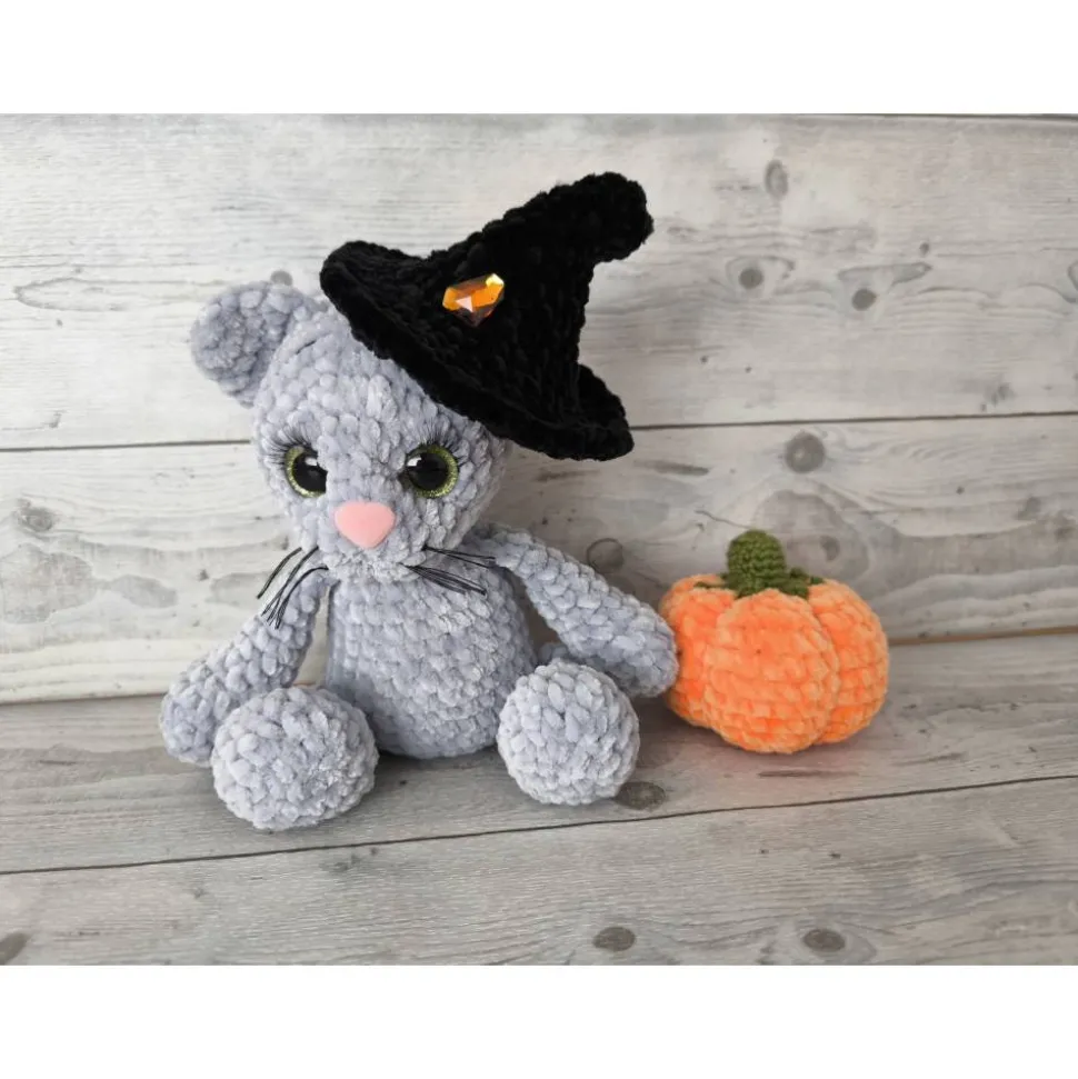 Farbe der Katze: Grau, Augen: Strahlend grün, Hut: Schwarzer Hexenhut, Accessoire: Weicher orangefarbener Kürbis (ca. 7 cm hoch),