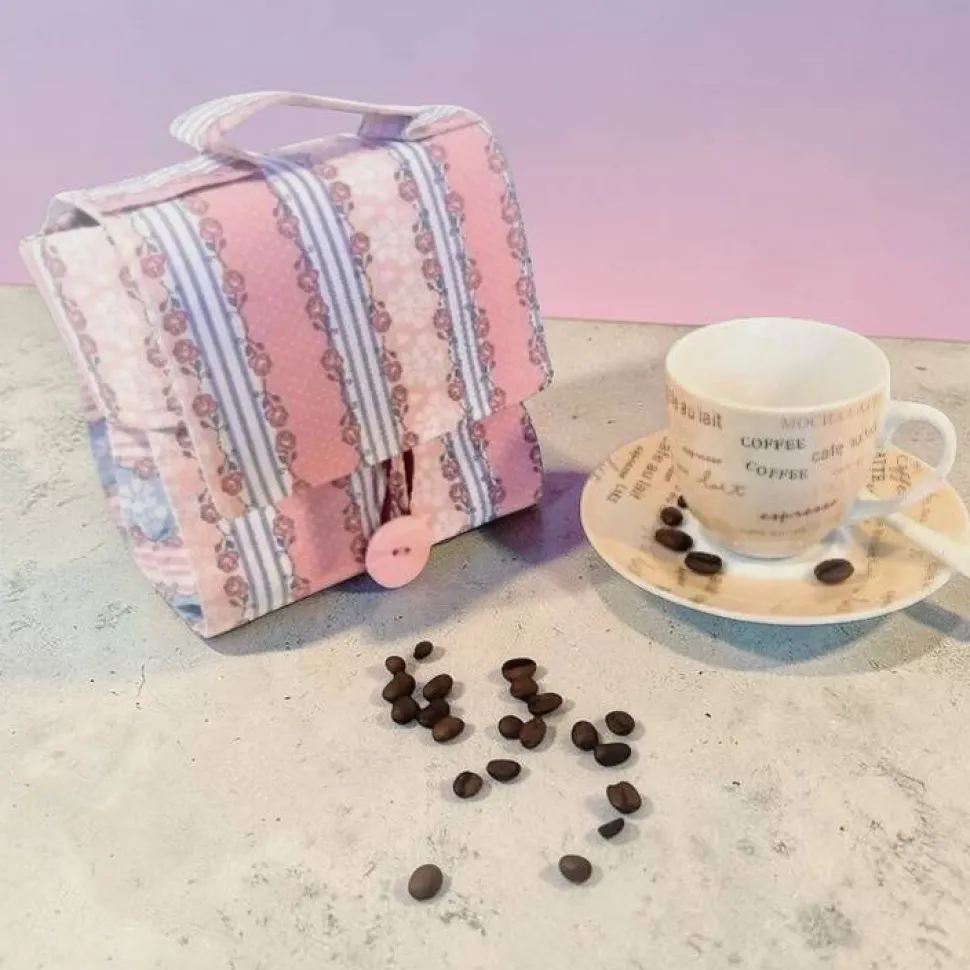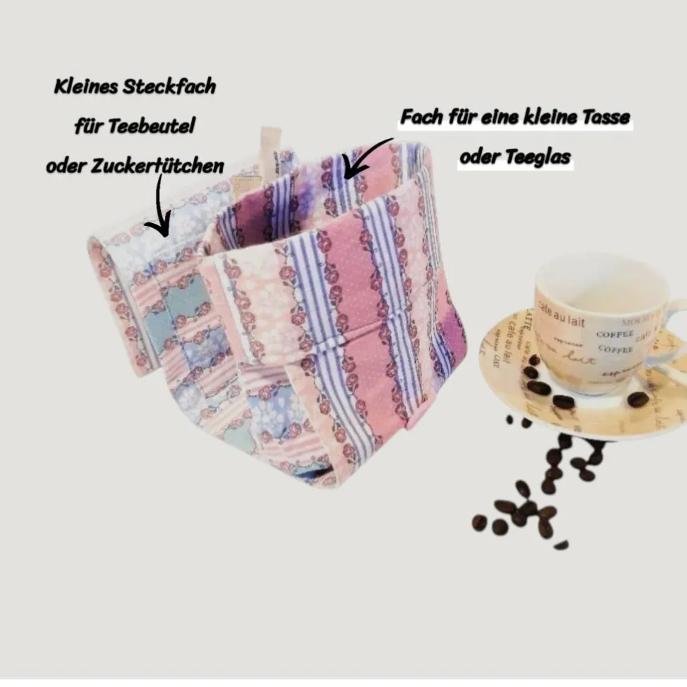 Diese Tasche bietet Stauraum für ein Kaffee- oder Teetasse, ein kleines Fach für Zuckertütchen oder Teebeutel. Tragegriff für ein schnelles mitnehmen und per Druckknopf verschließbar. Ob für den Arbeitsplatz oder als nettes Muttertags Geschenk. Nett befüllt mit Pralinen usw…, ist diese süße kleine Tasche auf jeden Fall ein „Hingucker“. Eine nette Idee auch als Mitbringsel gefüllt mit Gebäck, Süßem oder befüllt mit Wellness Produkten, wie z.B. Gesichtsmasken, Seifen, Handcreme…