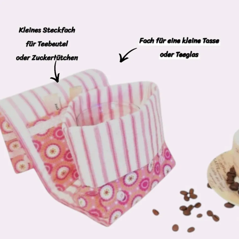 Diese Tasche bietet Stauraum für ein kleine Kaffee- oder Teetasse, ein kleines Fach für Zuckerbeutelchen oder Teebeutel. Tragegriff für ein schnelles mitnehmen, verschlossen per Kamsnaps. Ob für den Arbeitsplatz oder als nettes Muttertagesgeschenk mit dem Schriftzug „Mama´s Moment“. Nett befüllt mit Pralinen usw…, ist diese süße kleine Tasche auf jeden Fall ein „Hingucker“. Eine nette Idee auch als Mitbringsel gefüllt mit Gebäck oder Süßem.