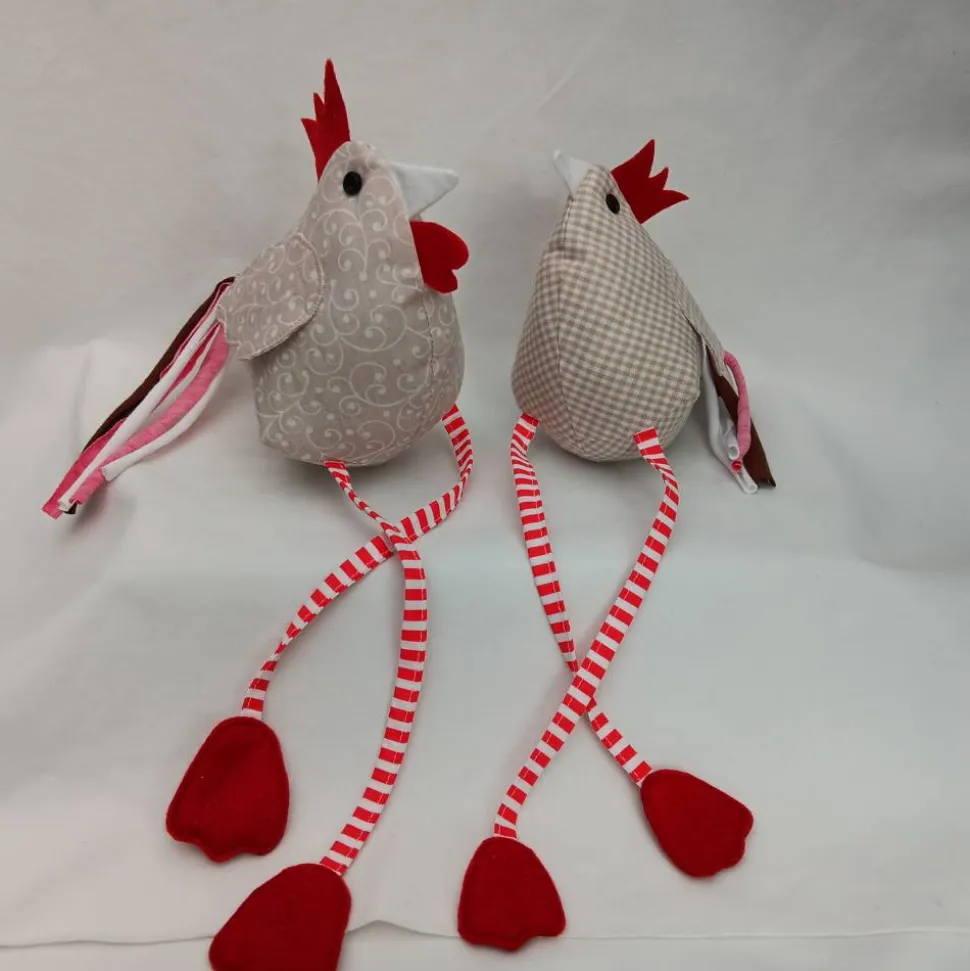 Dieses hübsche Pärchen findet sicher schnell einen Platz in jeder Wohnung. Gemütlich sitzen sie da und lassen fröhlich ihre langen Beine baumeln. Hahn und Huhn sind aus unterschiedlichen beigen Baumwollstoffen genäht. Sie haben aufgesetzte Flügel, lange rotgestreifte Beine aus Baumwollstoff mit roten Filzfüßen und weiße Stoffschnäbel. Als Augen dienen kleine Knöpfen. Die Kämme sind ebenfalls aus rotem Filz gearbeitet. Die lustigen Schwanzfedern bestehen aus Jersey-Streifen in braun, rot und weiß beim Hahn und beim Huhn. Das Pärchen ist mit Polyesterwatte ausgestopft.