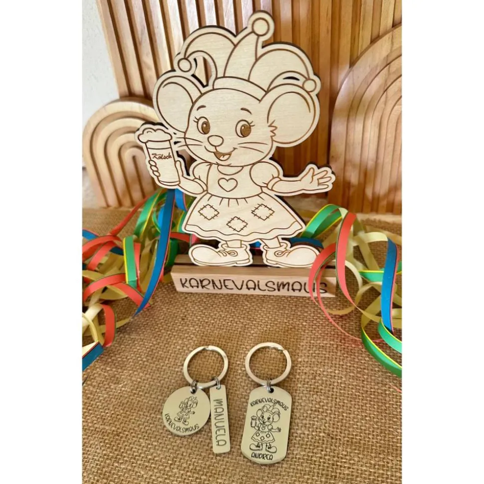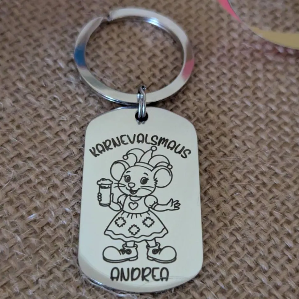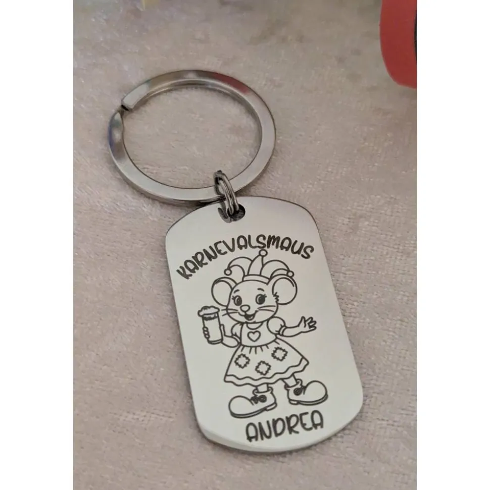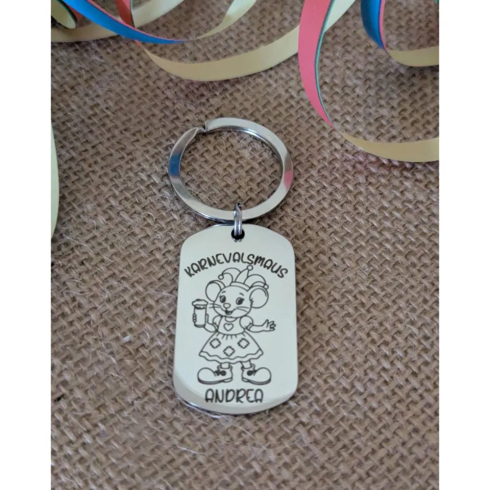 Karnevalsmaus Schlüsselanhänger– Personalisiert, rechteckig, rostfreier Edelstahl, tolles Accessoire für Karneval