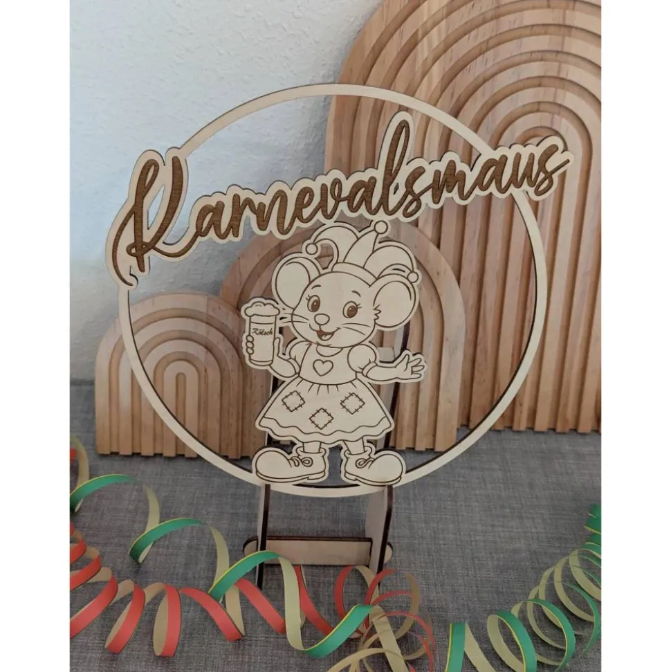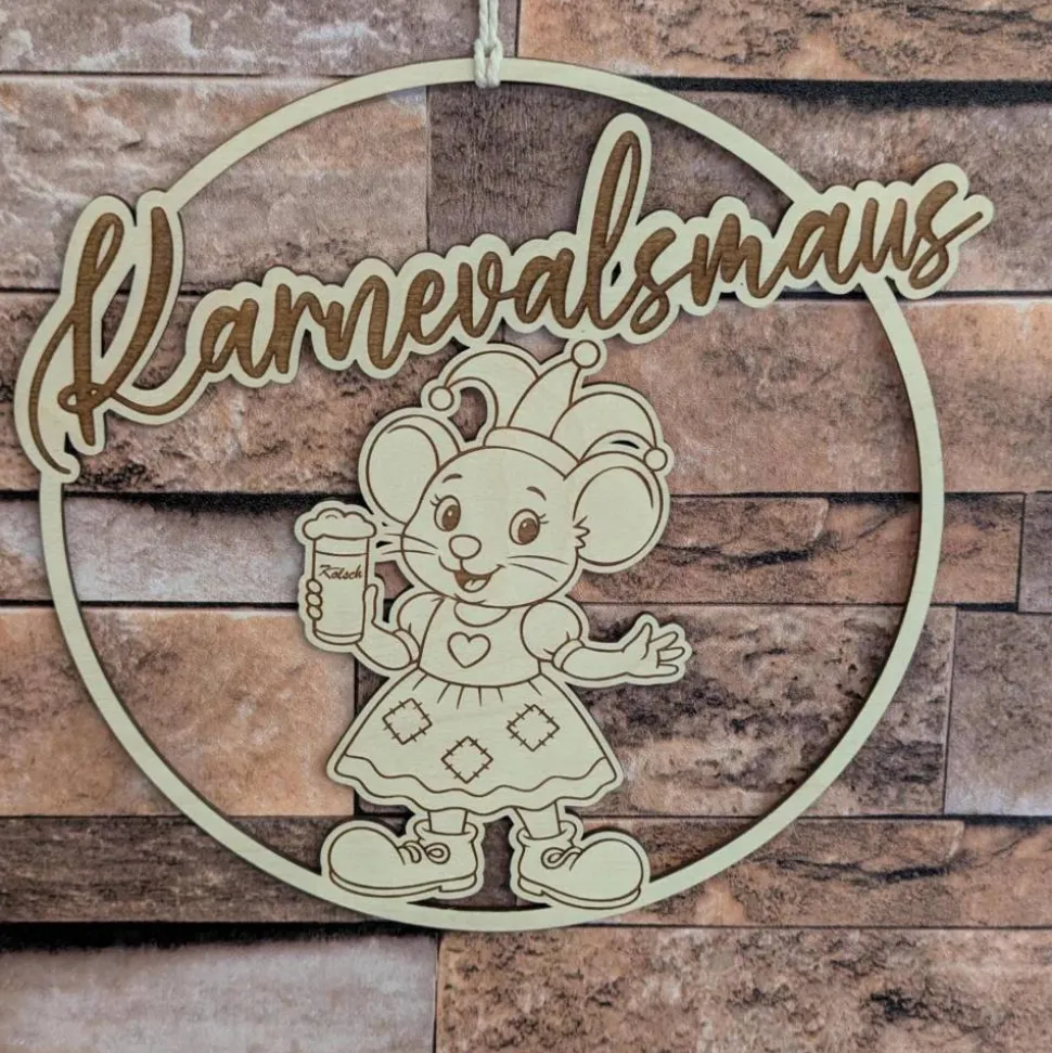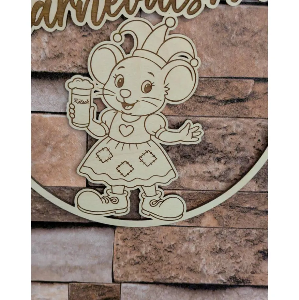 Dieser einzigartige Türkranz / Wanddeko Karnevalsmaus ist das perfekte Accessoire für alle Karnevals- und Jecken-Fans. In der Hand hält sie ein Kölsch und wird aus hochwertigem 3mm Birkensperrholz hergestellt. Der Loop hat einen Durchmesser von 20 cm, was sie zu einem auffälligen und langlebigen Dekorationsstück macht.