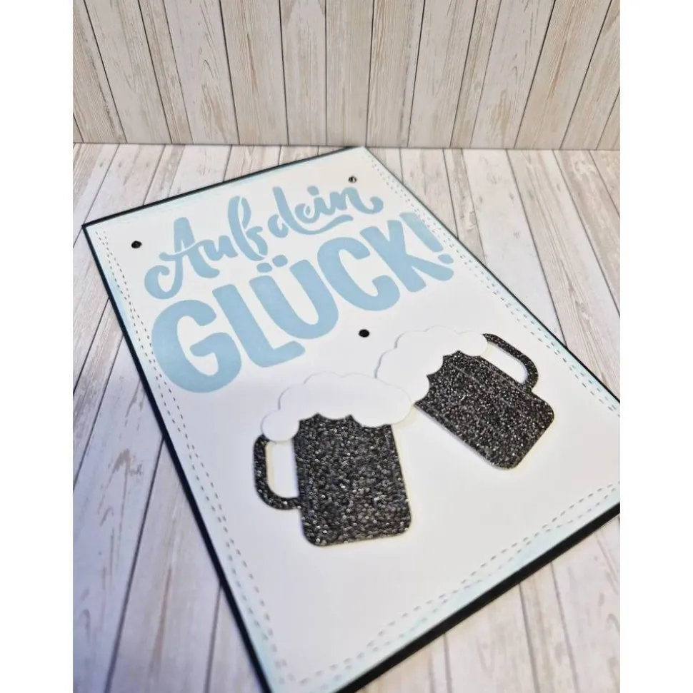 DER WEIßE AUFLEGER MIT DEM SCHABLONIERTEN SPRUCH IST AUF EINE SCHWARZE KLAPPKARTE AUFGEKLEBT.AUF DIESEN AUFLEGER WURDEN STANZTEILE BIERKRÜGE UND DREI STRASSSTEINCHEN BEFESTIGT.