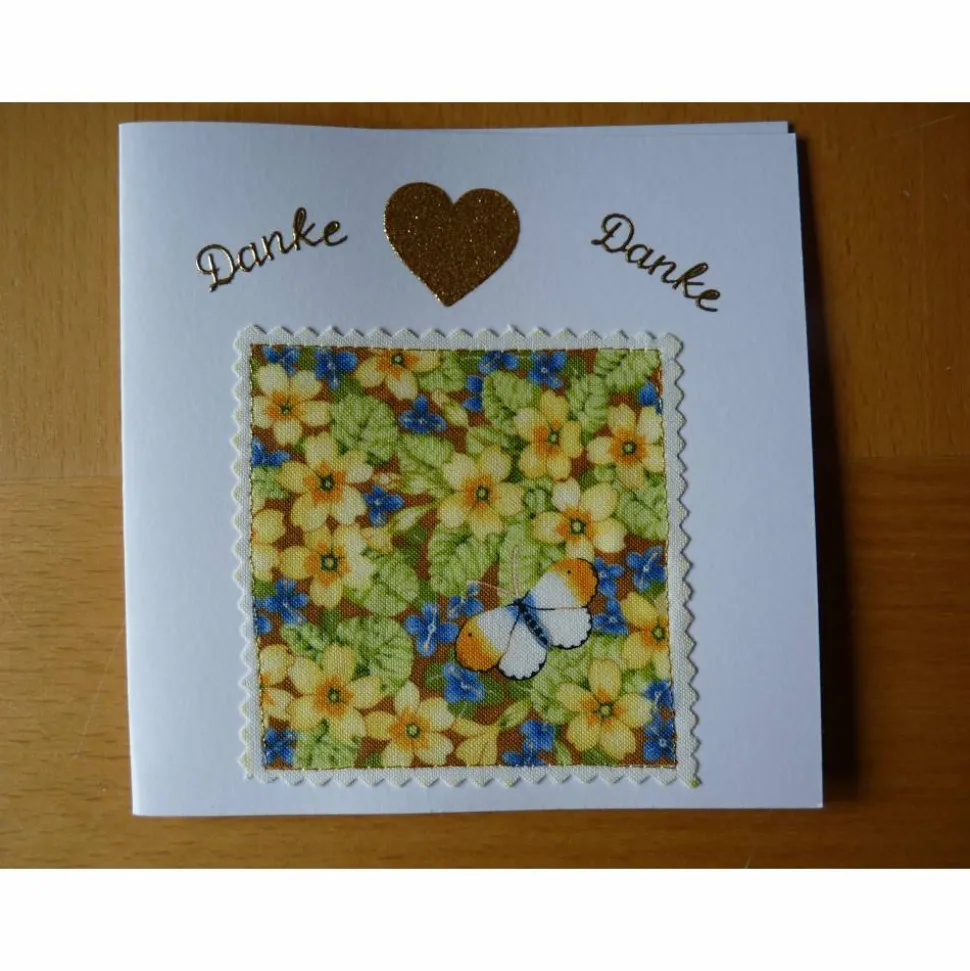 Schenke von Herzen Dank! Mit dieser ausgefallenen Karte für einen lieben Menschen sagst du stilvoll Danke.Die Karte besticht durch ihr einzigartiges Stoffbild,das liebevoll aufgeklebt und aufgenäht wurde. Die dekorativen Sticker machen jede Karte zum besonderen Unikat. Die innen sichtbare Naht, wie auf dem zweiten Foto gezeigt, unterstreicht die hochwertige Handarbeit.