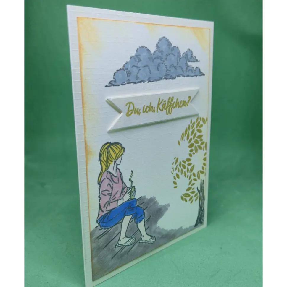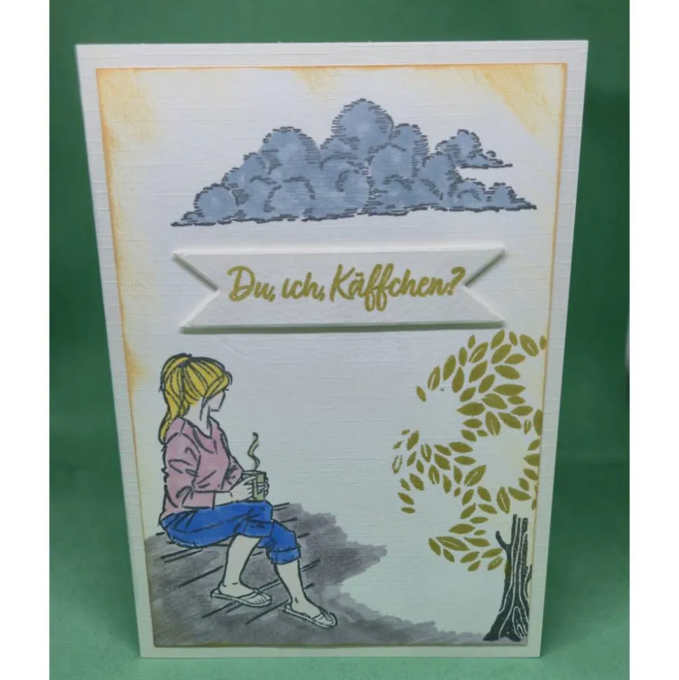 Diese liebevoll gestaltete Karte zeigt eine entspannte Frau mit Kaffeetasse, umgeben von sanften Wolken und einem friedlichen Baum – ein Symbol für Geborgenheit und neue Anfänge.