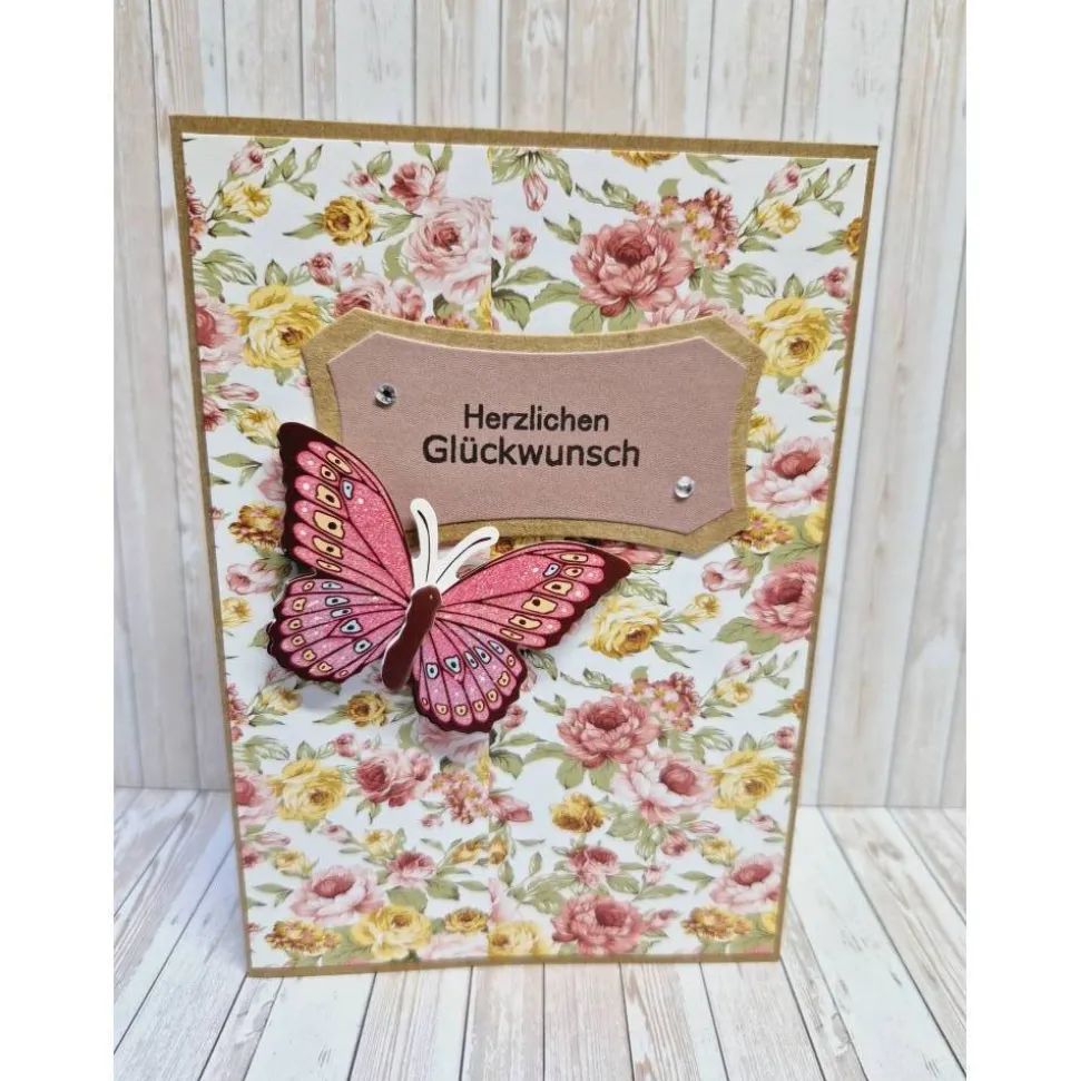 Überrasche zum Geburtstag mit einer einzigartigen Karte: Diese hübsche Karte in der Größe 14,7 x 10,3 cm sorgt für Freude und bleibt in Erinnerung. Der Aufleger mit wunderschönem Blumenmotiv ist auf eine kraftfarbene Klappkarte aufgeklebt. Ein gelber Schmetterling, ausgestanzte Details und zwei funkelnde Strasssteinchen verzieren die Vorderseite und machen sie zu etwas ganz Besonderem.