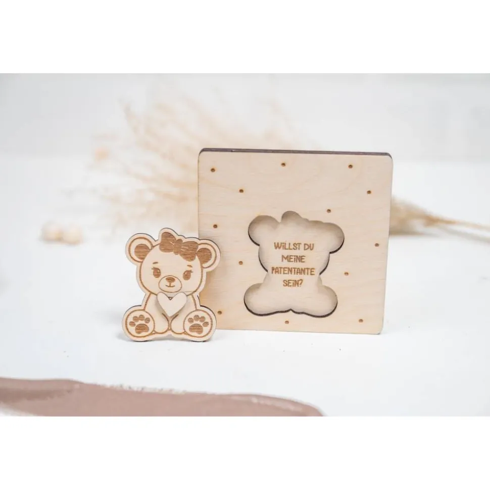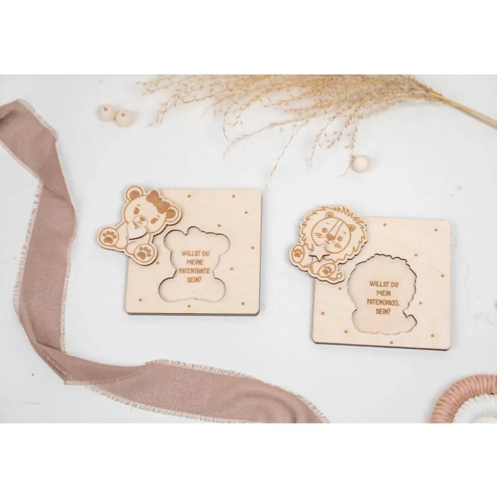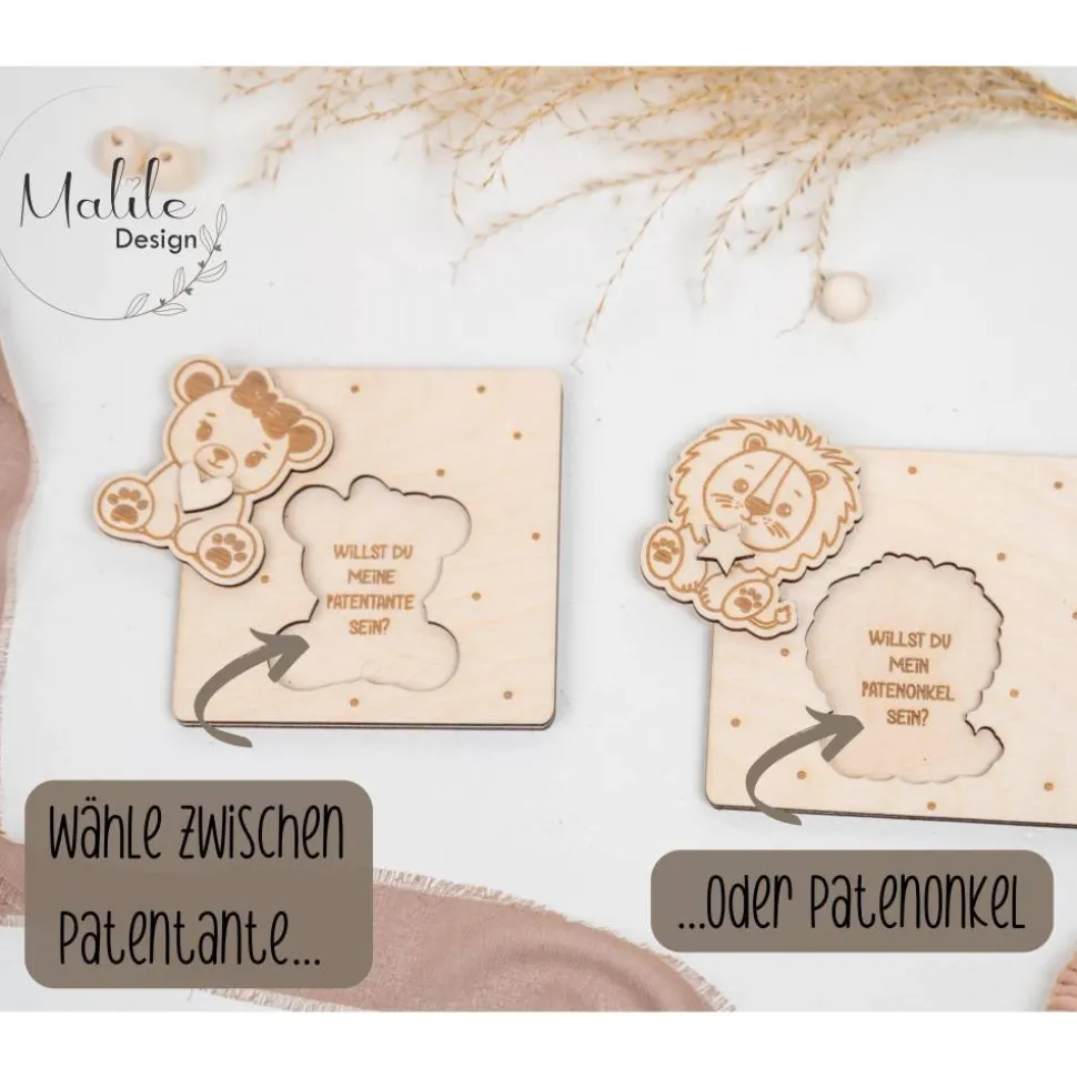 Jede Karte ist aus hochwertigem Holz gefertigt und zeigt ein liebevoll gestaltetes Tiermotiv. Doch das Besondere daran ist: Wenn du das Motiv anhebst, erscheint darunter die Frage: „Willst du mein Patenonkel werden?“ oder „Willst du meine Patentante werden?“. Diese individuelle Überraschung macht den Moment unvergesslich und sorgt garantiert für ein Lächeln auf den Lippen des zukünftigen Paten.
