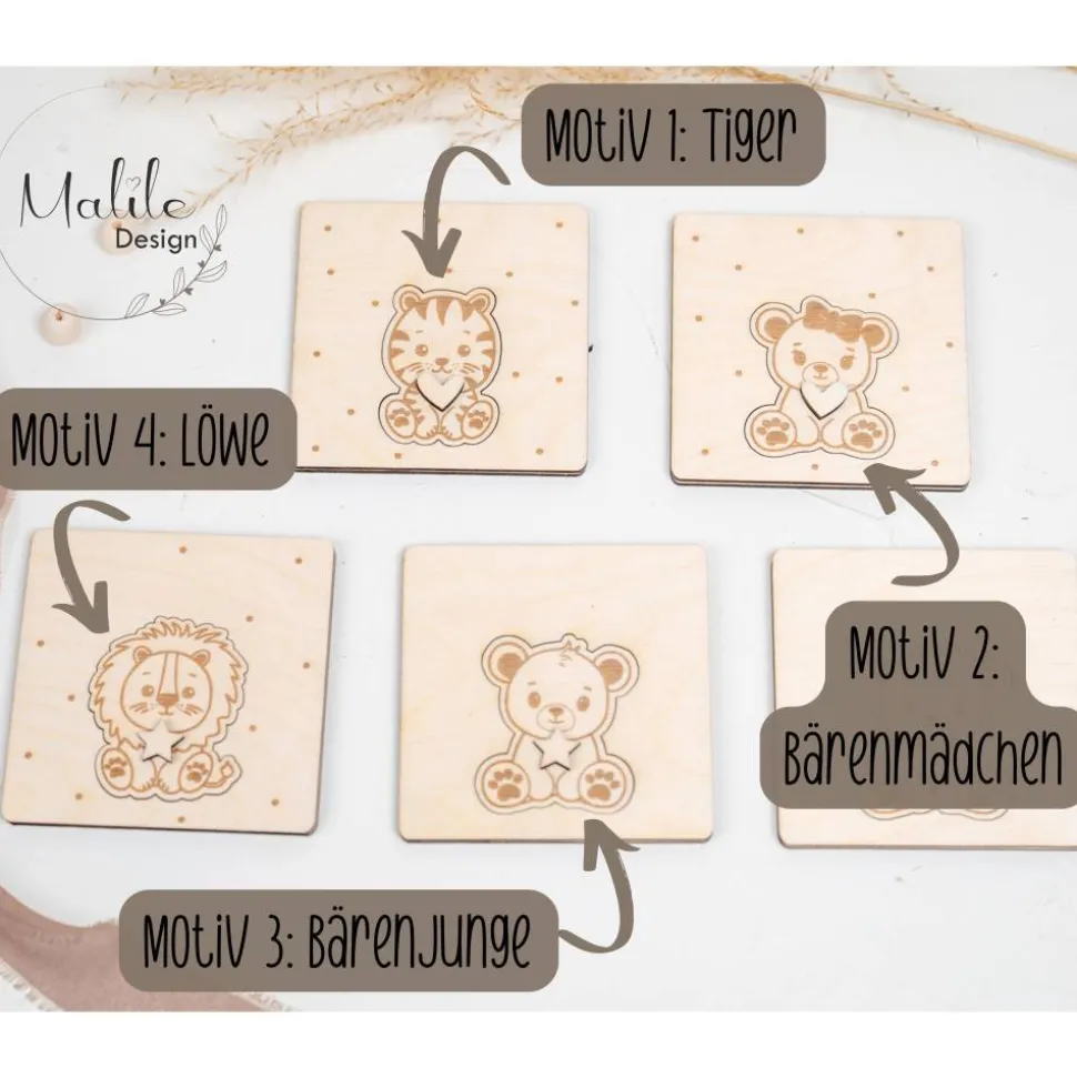 Du kannst zwischen 4 verschiedenen Tiermotiven wählen. Außerdem kannst du dir als kleinen Knopf aussuchen ob du lieber einen kleinen Stern oder Herz haben möchtest.