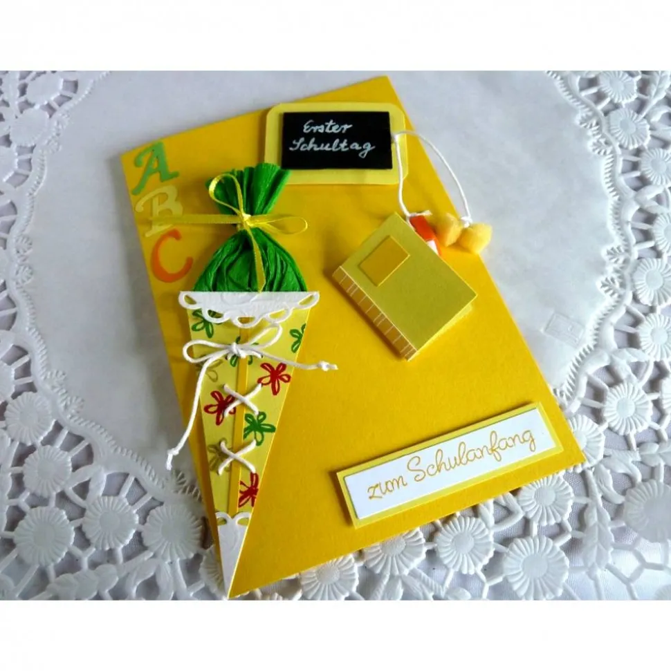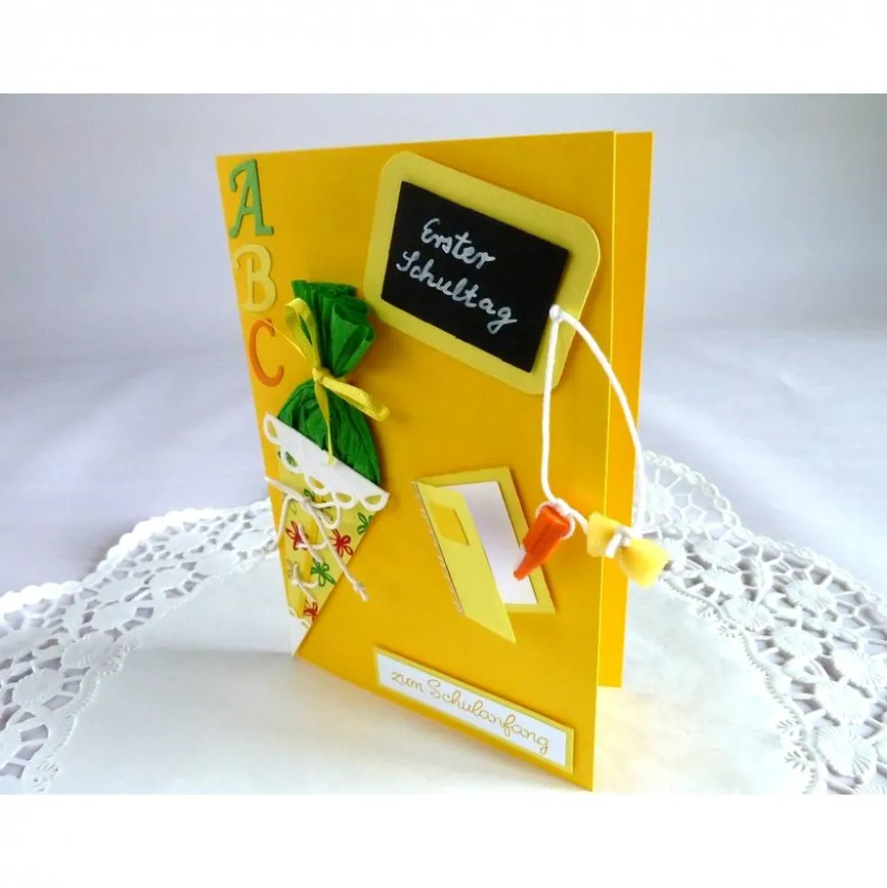 Selbstgemachte, wunderschöne und aufwändig gearbeitete Karte zur Einschulung, mit Schultüte, Heft, Tafel mit kleinem Schwamm und Buntstift (der Stift ist nicht echt sondern ein Knopf). Alles bis auf Stift und Schwämmchen wurde von mir selbstgemacht, je nach Verfügbarkeit meiner Bastelutensilien kann es vorkommen, dass Stift, Papier, ABC und Band eine andere Farbe haben als auf dem Bild zu sehen ist.