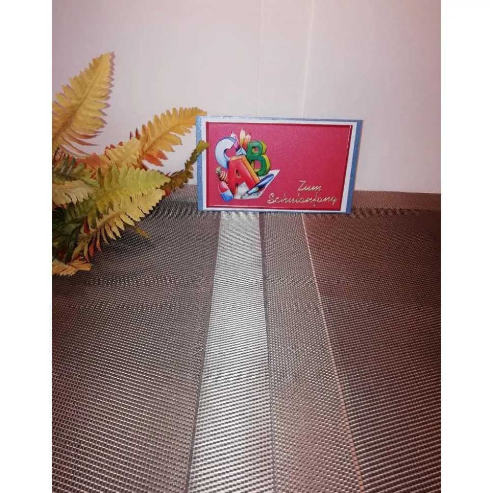 Verziert mit dem 3D Motiv zur Einschulung und dem goldenen Stickerspruch: Zum Schulananfang.