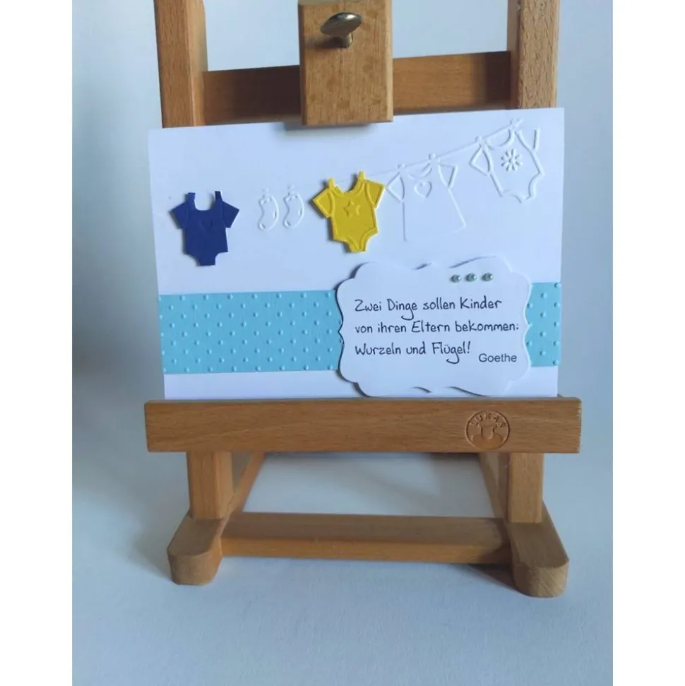 Die Karte ist in weiß/hellblau gehalten, mit einer Wäscheleinenprägung auf der ein blauer und gelber Body hängt, mit schönen aufgestempelten Spruch und mit Halbperlen dekoriert, das Kuvert hat aufgeprägte Babyfüsschen