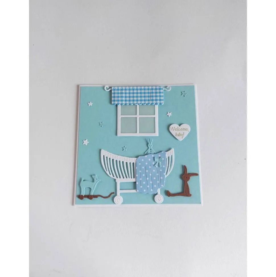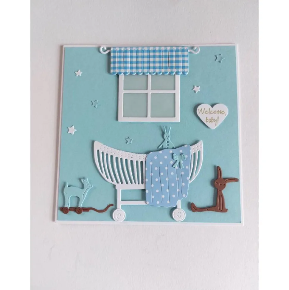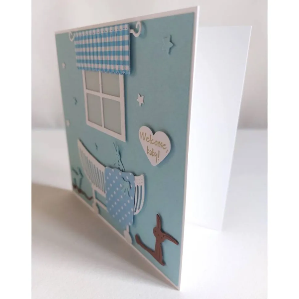 Aufwendig gearbeitete quadratische Klappkarte zur Geburt oderTaufe, die ich als Kinderzimmer dargestellt habe, sie kann auch in anderer Farbe und als Taufeinladung gearbeitet werden. Auf das Kuvert sind kleine Babyfüßchen geprägt. Die Klappkarte wird mit Kuvert und Klarsichtshülle geliefert.