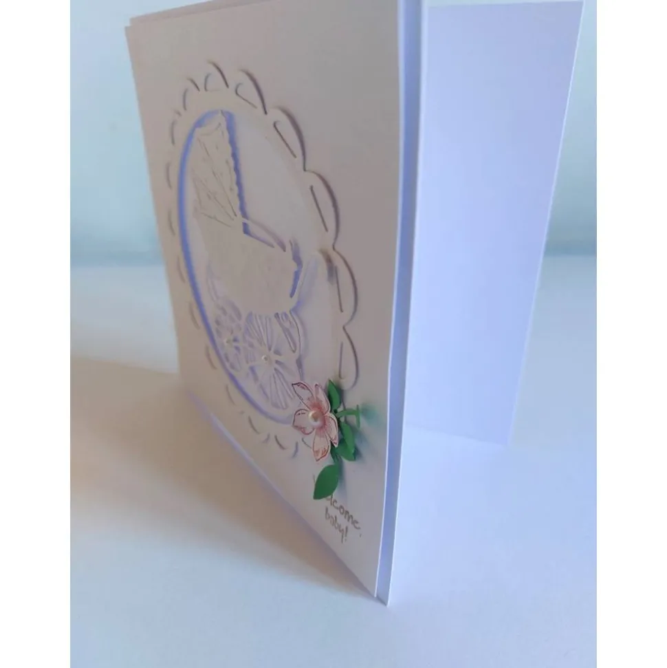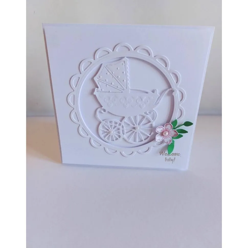 Aufwendig gearbeitete quadratische Klappkarte mit ausgestanzten und geprägtem Kinderwagen in einem schönen Rahmen mit Blüte, Zweig, Halbperlen und aufgestempelten Spruch. Auf das Kuvert hab ich kleine Babyfüßchen geprägt. Die Klappkarte wird mit Kuvert und verpackt in einer Klarsichtshülle geliefert.