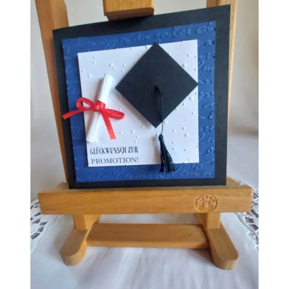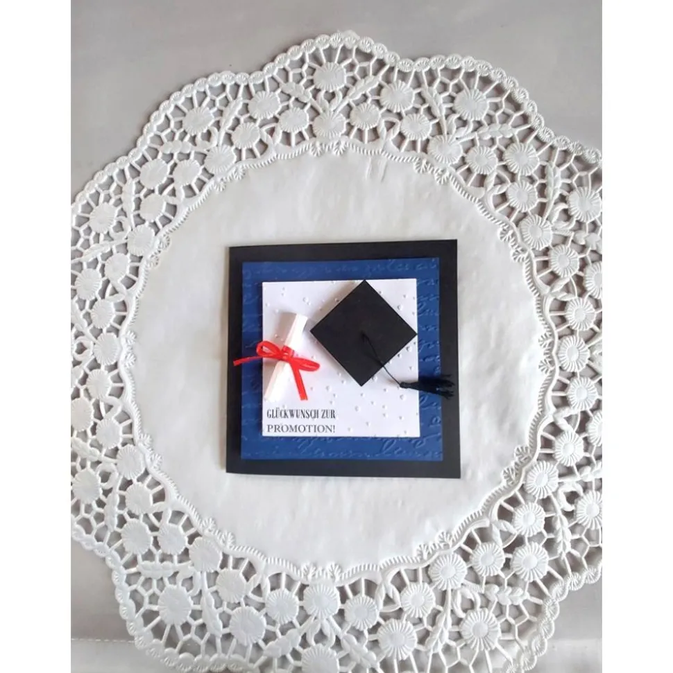 Klappkarte in Handarbeit gefertigt für jeden schulischen Abschluss, mit geprägtem Hintergrund, Doktorhut, handgefertigter Quaste und Schriftrolle. Die Glückwunschkarte wird mit Einlegeblatt und Kuvert geliefert.