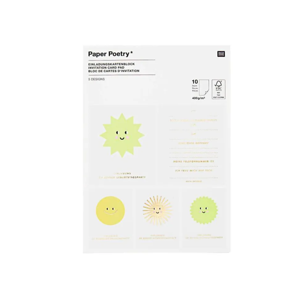 In dem Block sind 10 bereits vorgedruckte Einladungskarten enthalten. Die Vorderseiten sind in 5 Designs gestaltet. Die Rückseite ist vorgedruckt und kann individuell ausgefüllt werden.