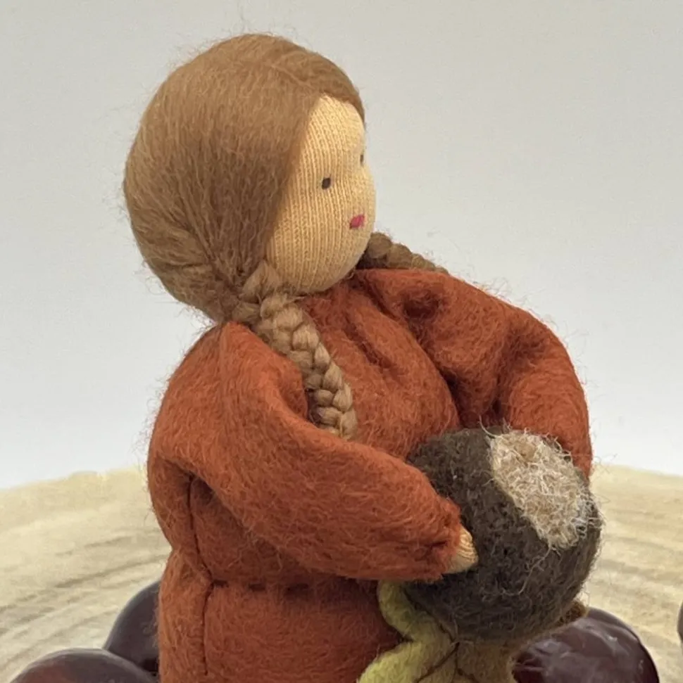 Sie sind ca. 12 cm groß und halten eine gefilzte Kastanie in den Händen.