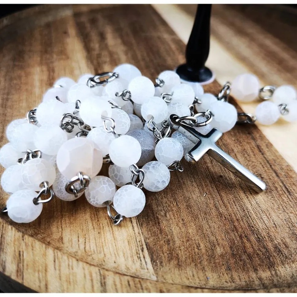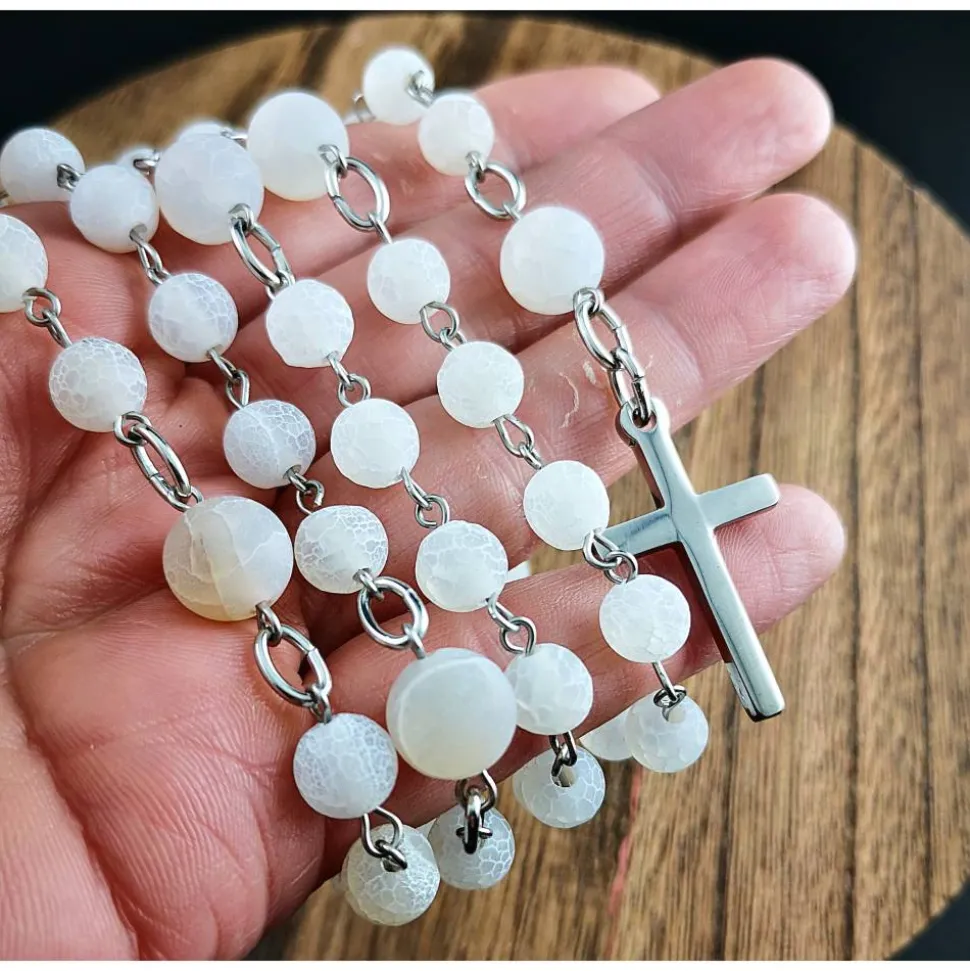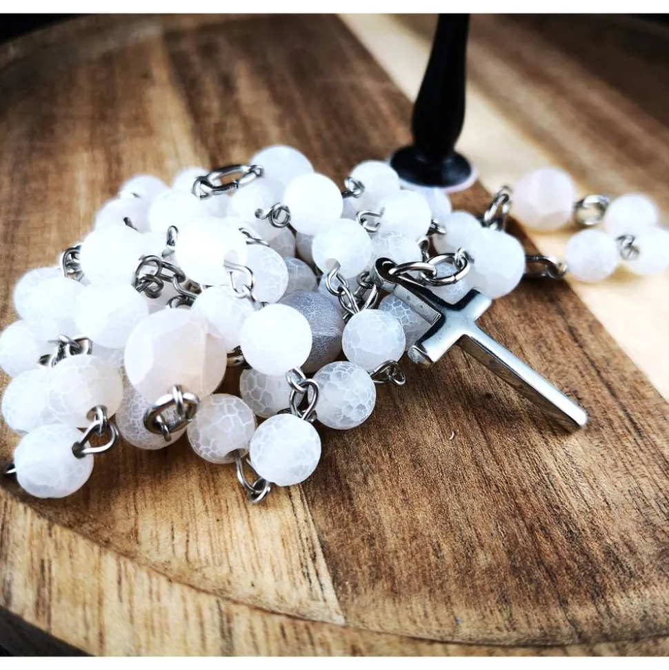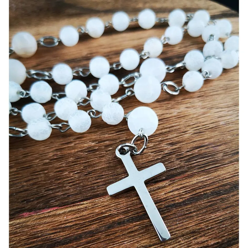 Die 8 mm und 10 mm großen Perlen sind in einem eleganten weiß-silbernen Design angeordnet und werden von hochwertigen Edelstahl-Kettelstiften, Verbindungsringen und einem schlichten Kreuz ergänzt.
