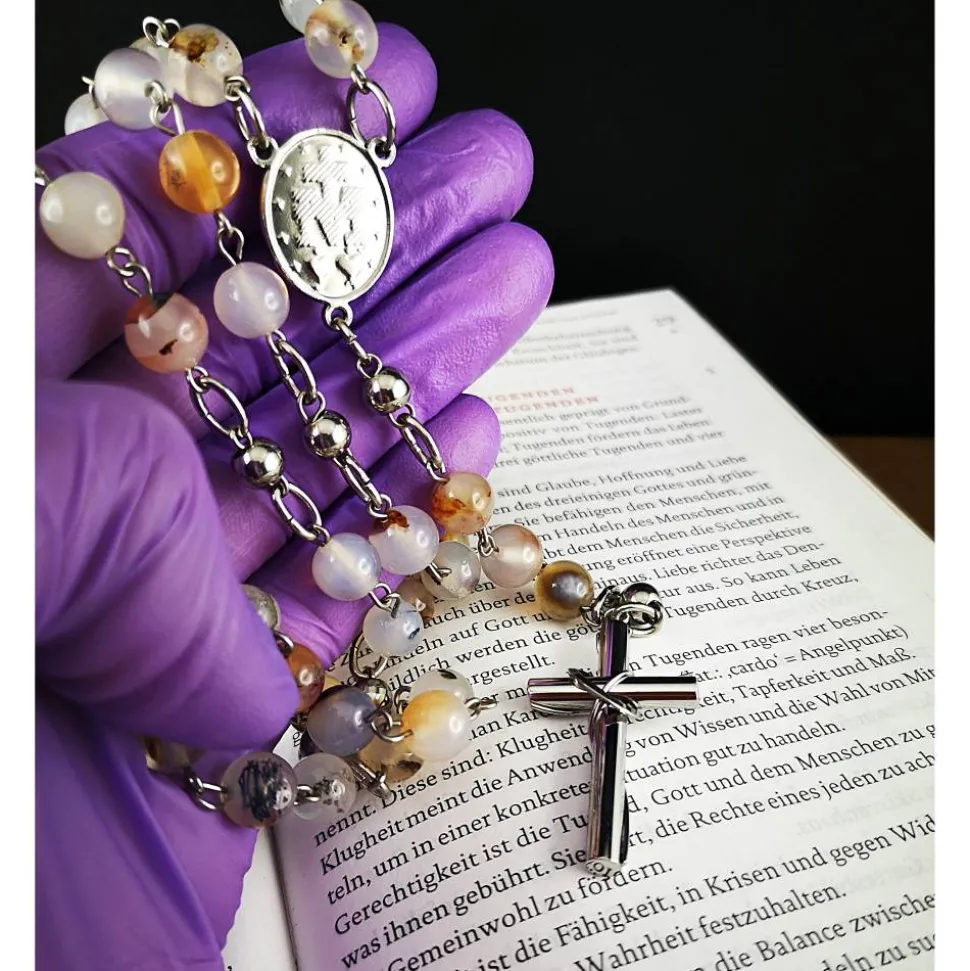 Entdecke einen einzigartigen katholischen Rosenkranz, der Tradition und modernes Design harmonisch verbindet. Dieser Rosenkranz aus edlen Achatperlen und hochwertigem Edelstahl ist nicht nur ein spirituelles Symbol, sondern auch ein stilvolles Accessoire für deinen Alltag.