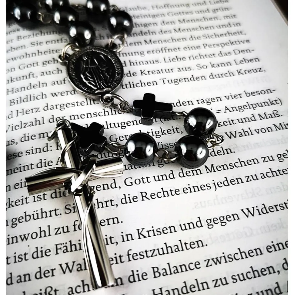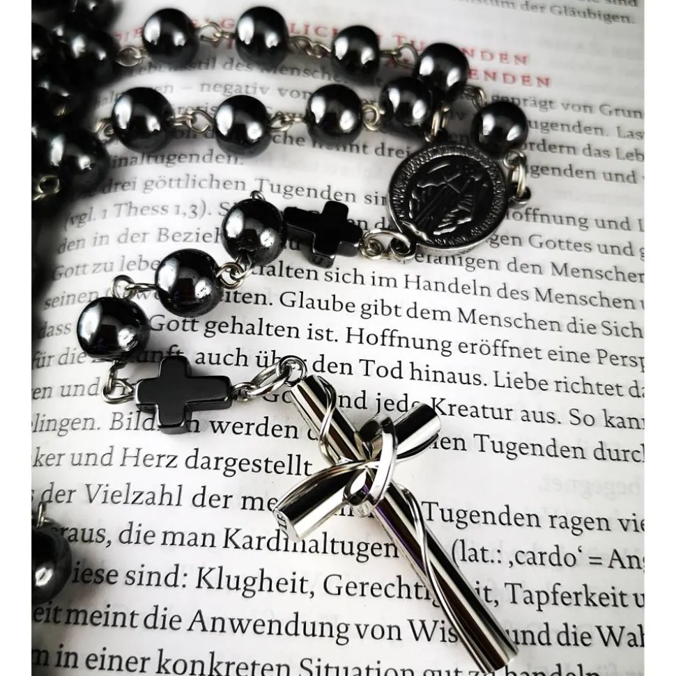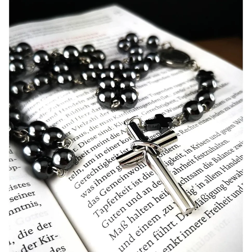 Entdecke den katholischen Rosenkranz mit Hämatitperlen (unmagnetisch) und Edelstahl – das perfekte Schmuckstück, das traditionelle Spiritualität und modernes Design in einem einzigartigen Accessoire verbindet.