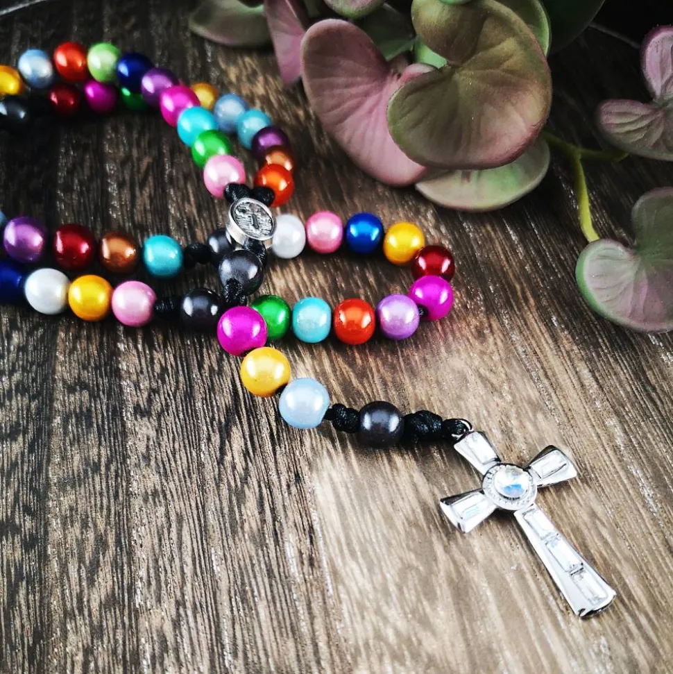 Der bunte katholische Rosenkranz mit Kreuzauswahl ist ein handgeknüpftes Stück, das nach Ihren Wünschen gefertigt werden kann.