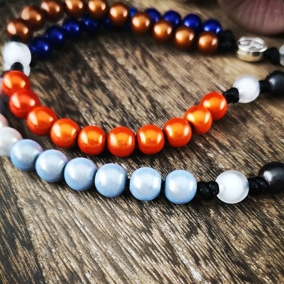 Er besteht aus 53 bunten 8 mm Miracleperlen und 6 matten, weißen Acrylperlen, die einen wunderschönen Kontrast bilden.