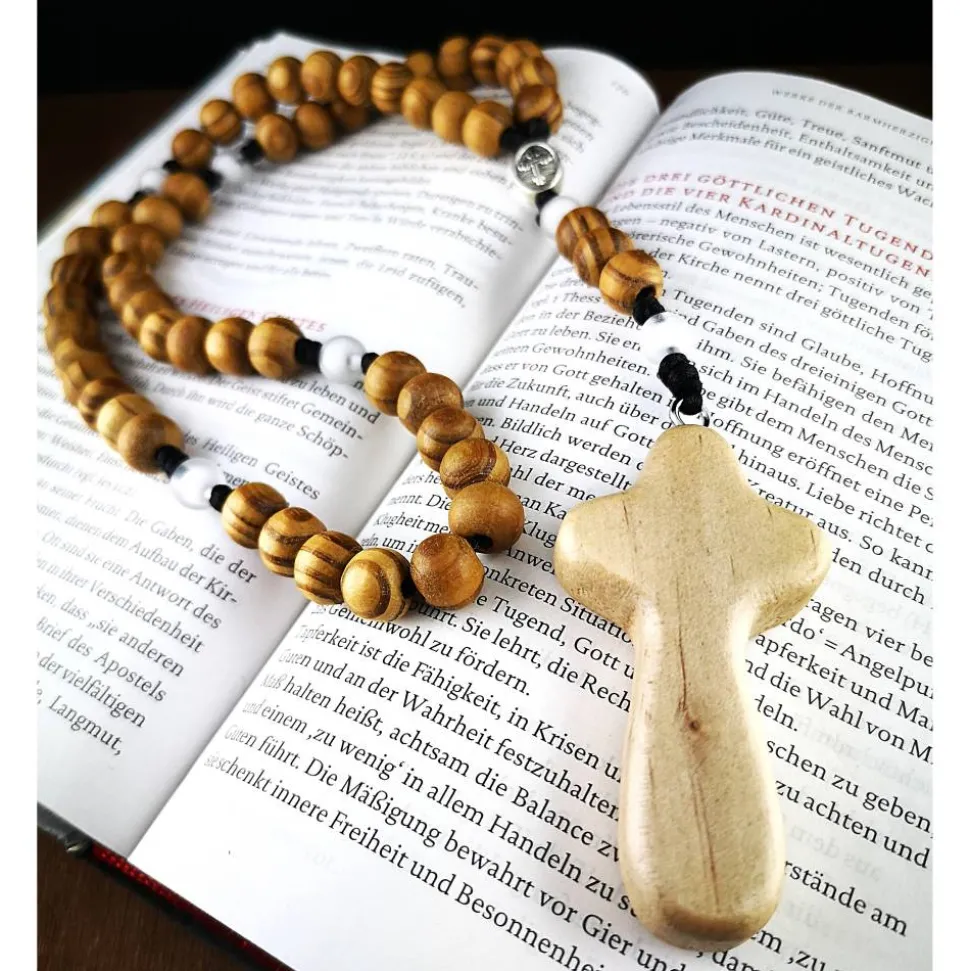 Die Kombination aus 10 mm Holzperlen und 8 mm matten Acrylperlen bildet einen wunderschönen Kontrast und verleiht dem Rosenkranz eine besondere Ausstrahlung.