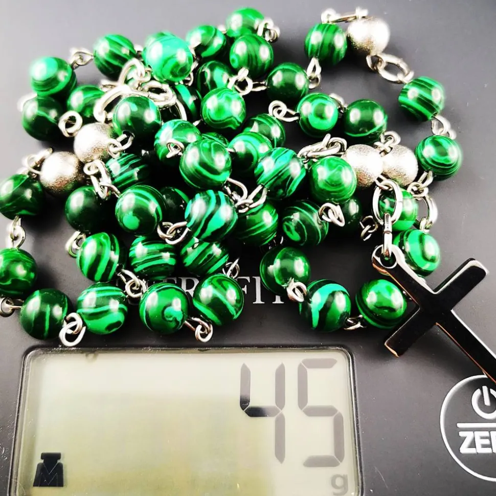 Die 8 mm großen Perlen sind in einem eleganten grün-silbernen Design angeordnet und werden von hochwertigen Edelstahl-Perlen, Kettelstiften, Verbindungsringen und einem schlichten Kreuz ergänzt.