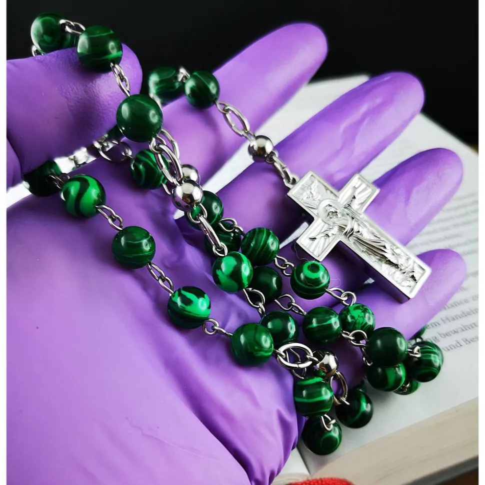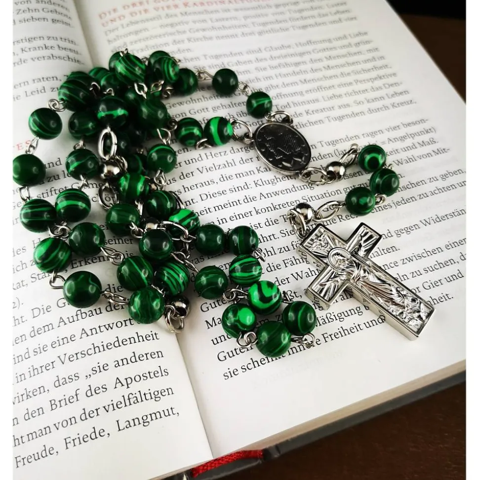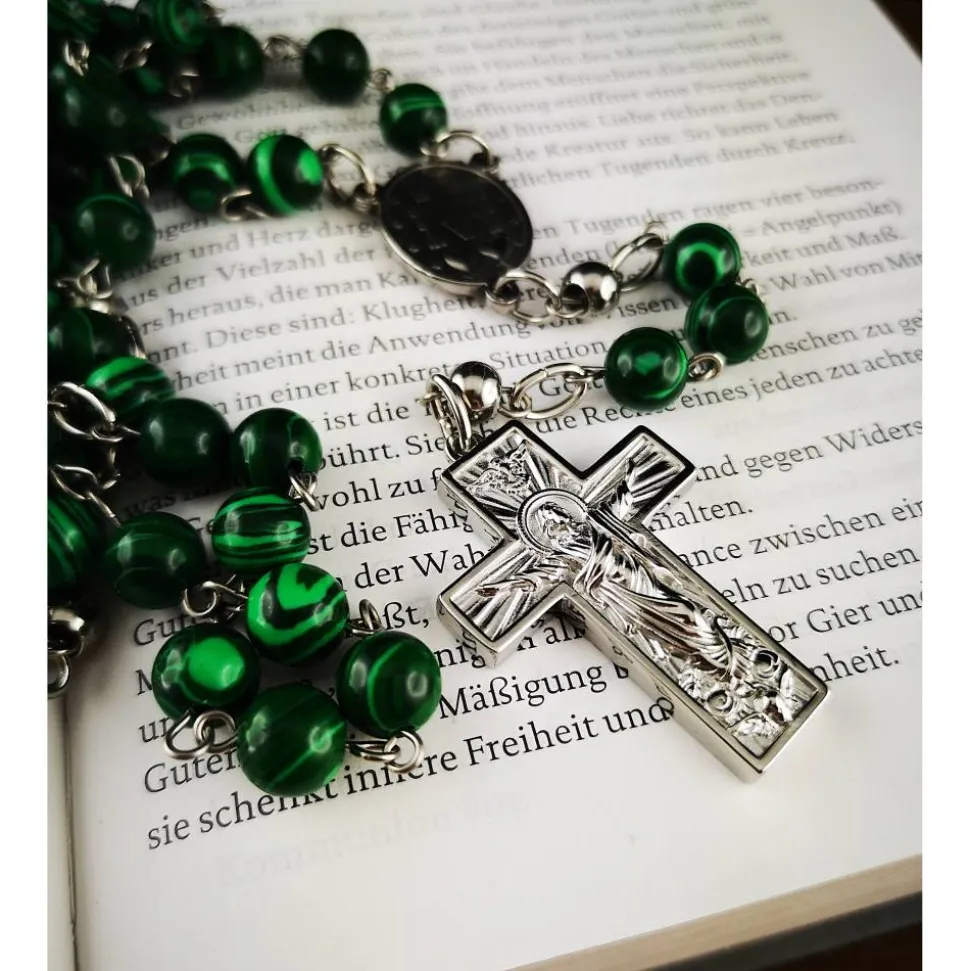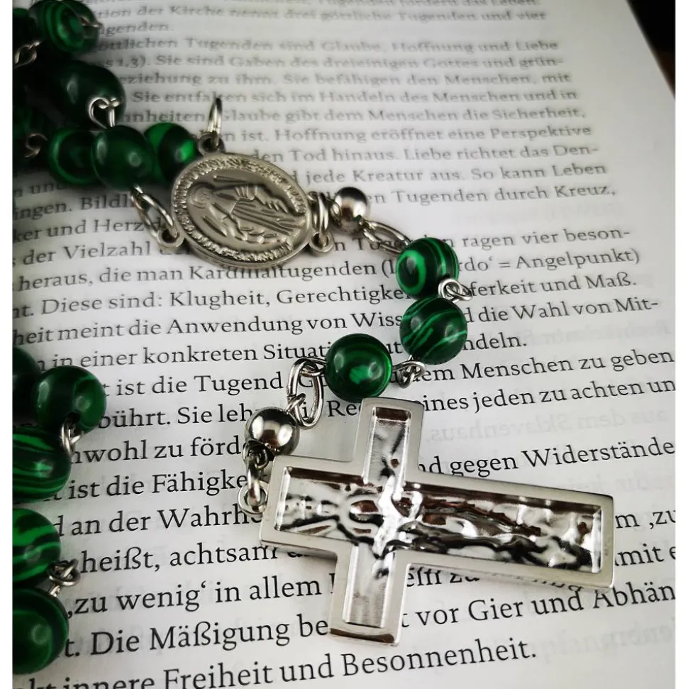 Entdecke den katholischen Rosenkranz mit synthetischen Malachitperlen und Edelstahl – ein wunderschönes und einzigartiges Schmuckstück, das Tradition und modernes Design harmonisch vereint.