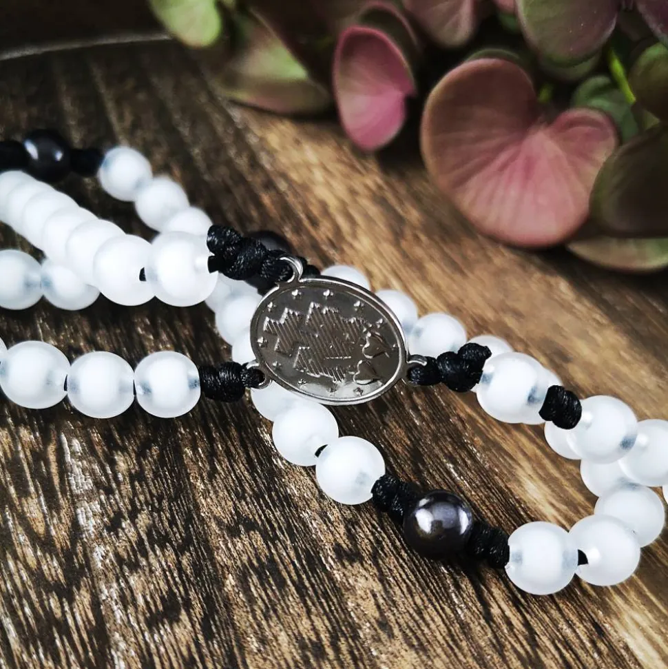 Er besteht aus 55 matten, weißen Perlen mit einem Durchmesser von 8 mm und 4 dunklen Miracleperlen, die in Kombination mit dem Herzstück aus Edelstahl einen wunderschönen Kontrast bilden.