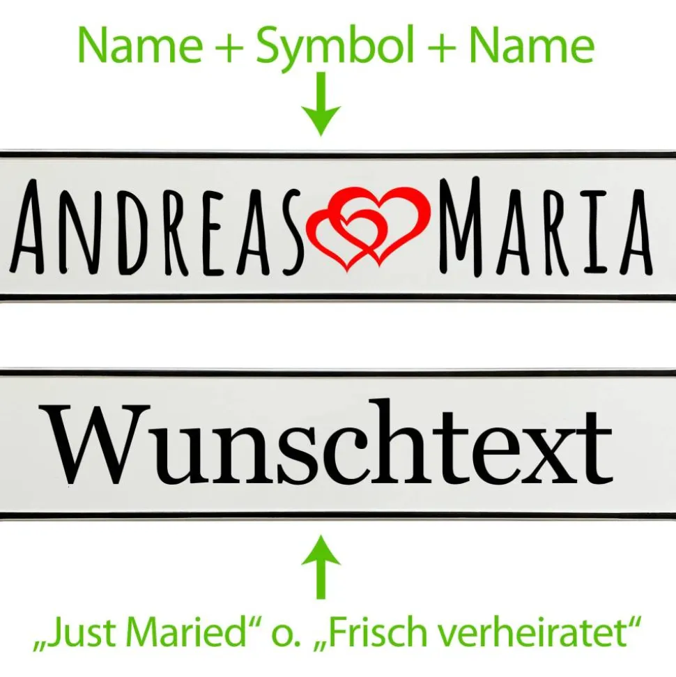 Du gibst einfach die gewünschten Namen an und wählst die passende Schriftart – wir fertigen dein persönliches Hochzeitskennzeichen mit viel Liebe zum Detail. Schon in kurzer Zeit hältst du deine individuelle Autodeko in den Händen.