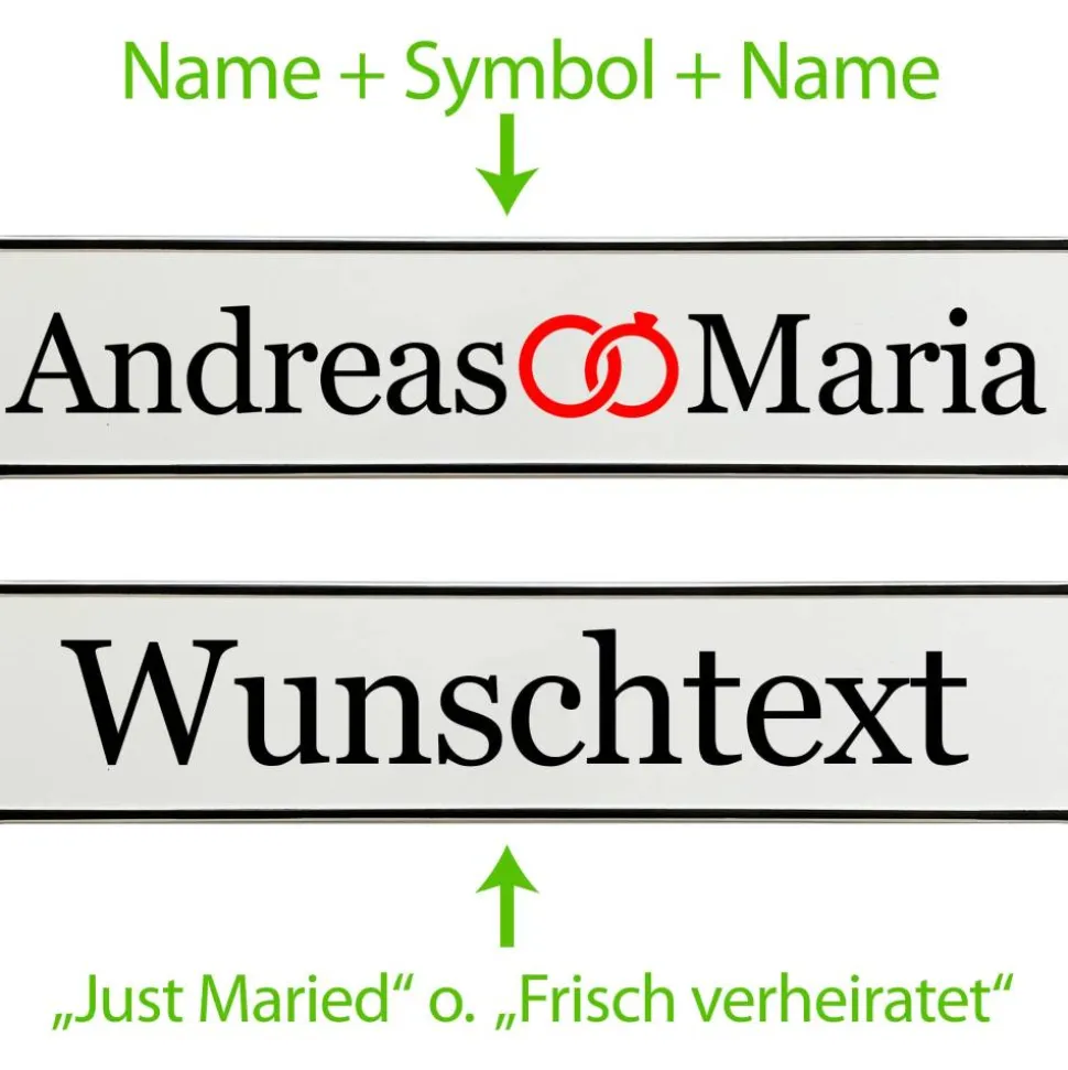 Stell dir vor, wie das Brautauto mit einem Schild glänzt, das eure Namen oder euren Wunschtext trägt. Damit wird dein Hochzeitsauto zur Bühne für den großen Auftritt.