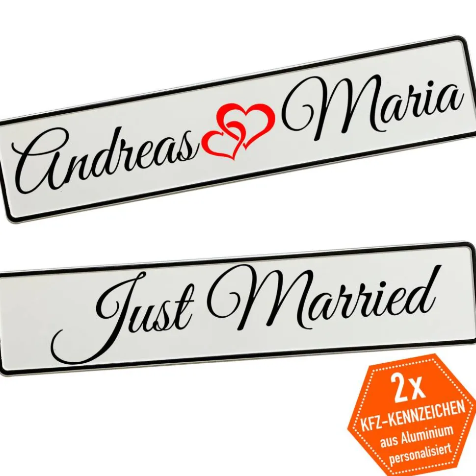 Du gibst einfach die gewünschten Namen an und wählst die passende Schriftart – wir fertigen dein persönliches Hochzeitskennzeichen mit viel Liebe zum Detail. Schon in kurzer Zeit hältst du deine individuelle Autodeko in den Händen.