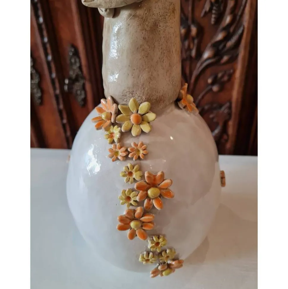 Der Hase und das Ei sind von Hand aufgebaut, glasiert und wurden bei 1225 Grad wetterfest gebrannt.
