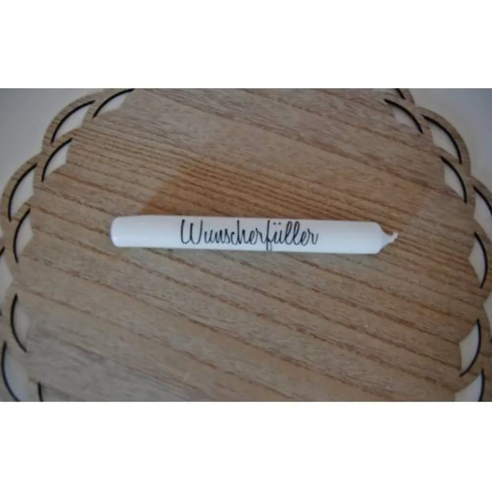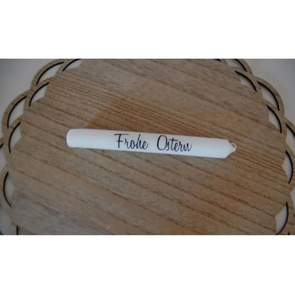 Kerzenfarbe: Weiß | Schriftfarbe: Schwarz , Folie: PVC-frei | Maße: ca. 18cm lang, ca. 2cm Durchmesser | *RAL-Gütezeichen | Brenndauer ca. 8 Stunden