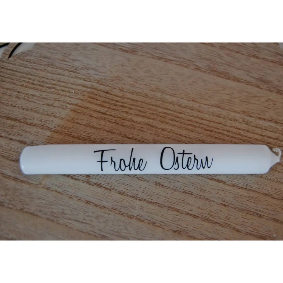 Kerzenfarbe: Weiß | Schriftfarbe: Schwarz , Folie: PVC-frei | Maße: ca. 18cm lang, ca. 2cm Durchmesser | *RAL-Gütezeichen | Brenndauer ca. 8 Stunden