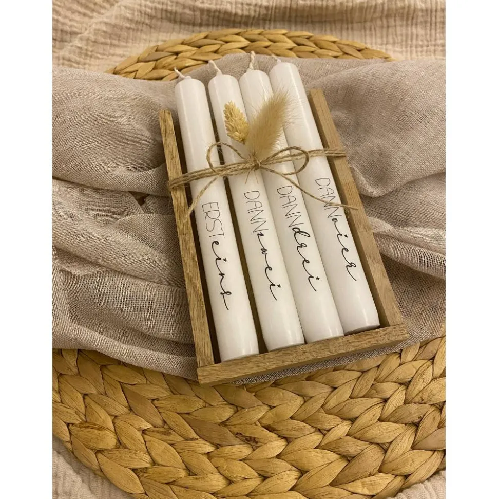 Versendet werden die Kerzen gut verpackt, wie abgebildet mit der schönen Umverpackung aus Holz.