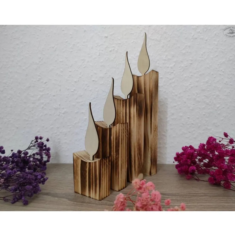 Mit diesen vier unterschiedlich hohe Holzkerzen im rustikalen, geflammten Design sind Ihrer Dekorations-Kreativität keine Grenzen gesetzt.