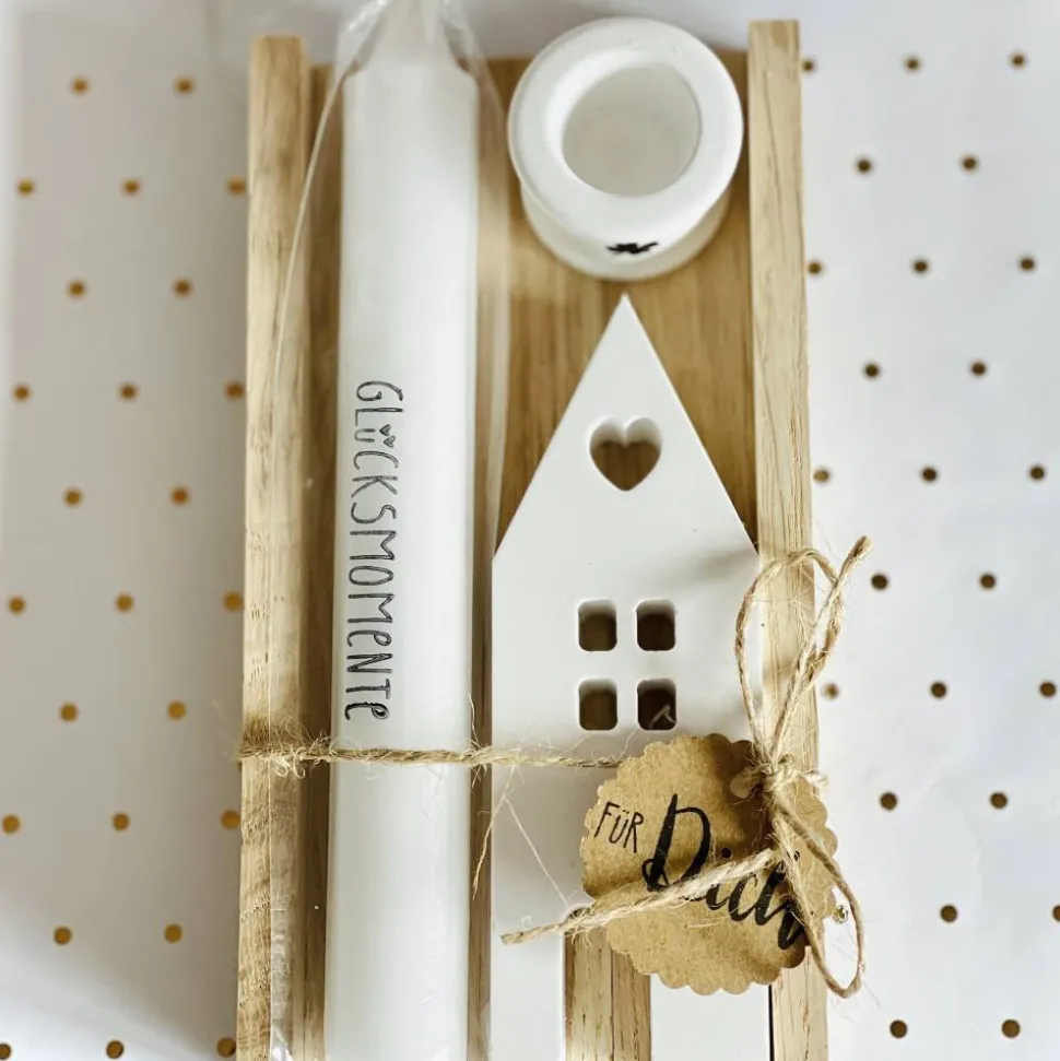 Das Geschenkset besteht aus einem Raysin Lichthaus, einem Kerzenhalter und einer passenden Stabkerze in weiß. Die Kerze selbst ist mit dem Spruch „Glücksmomente“ beschriftet. Der Kerzenhalter hat einen kleinen Kleeblatt Aufkleber aus Vinylfolie.