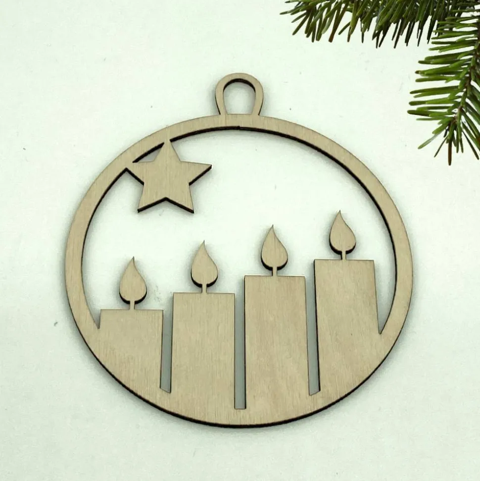 Dieser dekorative Anhänger ‚Kerzen mit Stern‘ bringt festliche Stimmung in jede Weihnachtsdekoration. Das Motiv zeigt vier Kerzen, die von einem strahlenden Stern begleitet werden – ein klassisches Symbol für Wärme, Licht und Hoffnung. Gefertigt wird der Anhänger aus 1,5 mm starkem, unbehandeltem Birkensperrholz, das mit präziser Laserschneidtechnik in feine Formen und klare Linien gebracht wird. Dadurch entsteht ein filigranes und dennoch stabiles Dekorationselement.