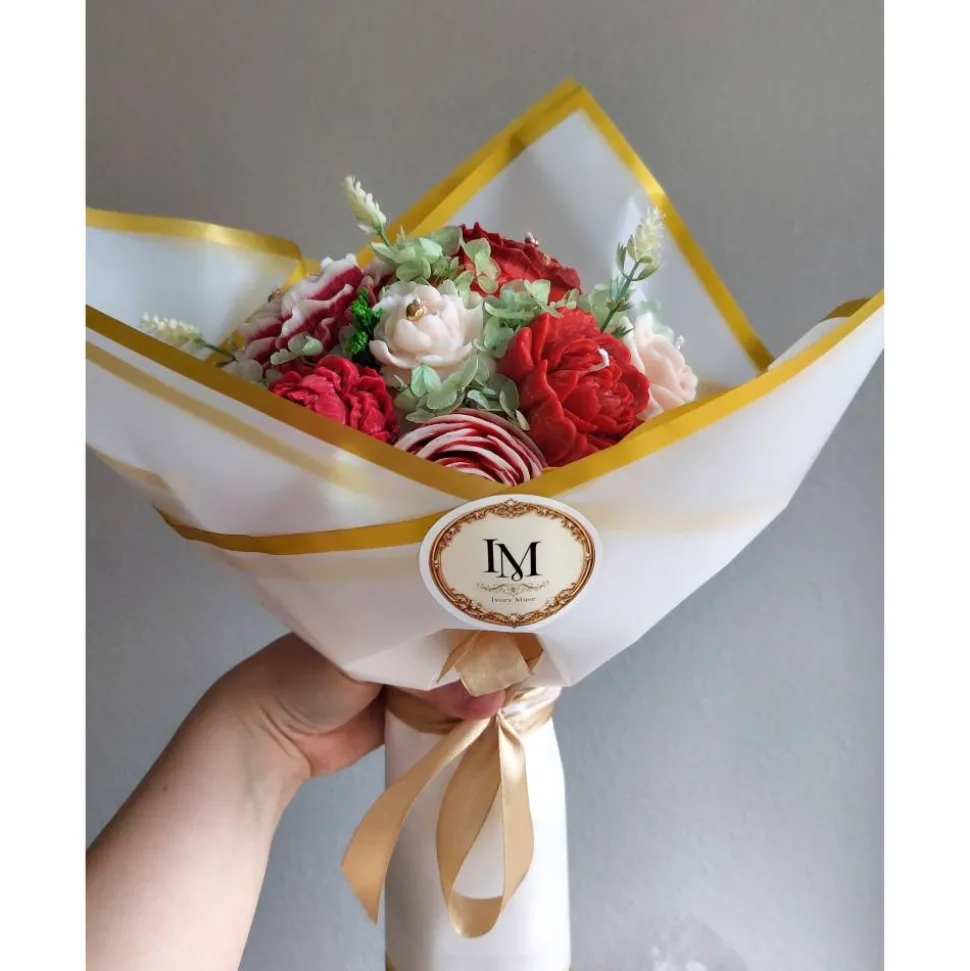Der Strauß vereint sanfte Creme-, Rosé- und Rottöne und wirkt dadurch besonders edel und dekorativ.