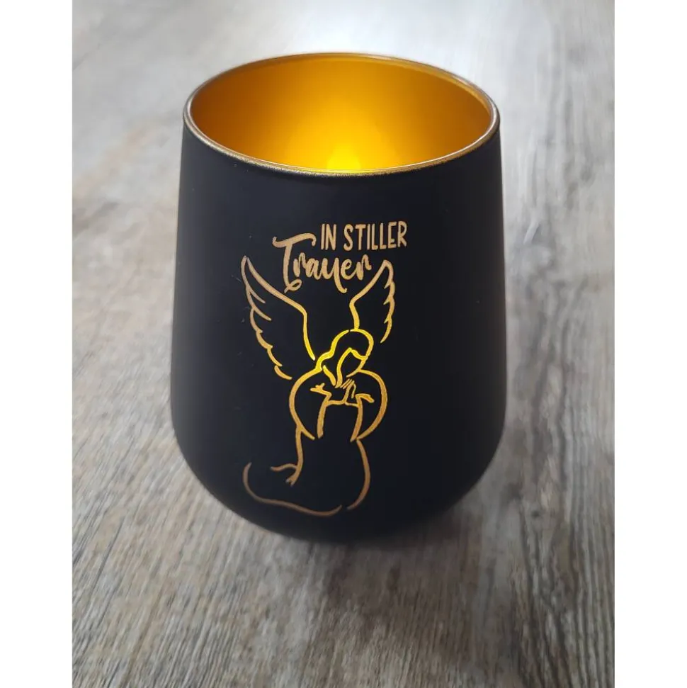 Dieses schwarze Glas ist graviert, somit scheint das Kerzenlicht wunderbar warm durch das Glas.