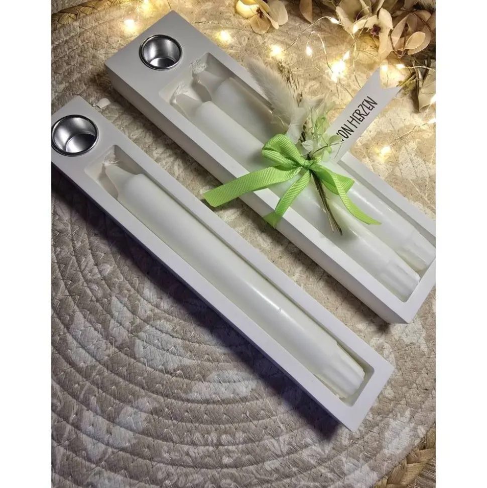 Wähle zwischen Einzel- oder Doppelhalter – beide Varianten werden mit passenden weißen Stabkerzen geliefert. Besonders liebevoll: Die Doppelhalter-Variante ist auf dem Produktfoto mit einer zarten Schleife und dekorativen Trockenblumen verziert und setzt damit einen ganz besonderen Akzent.
